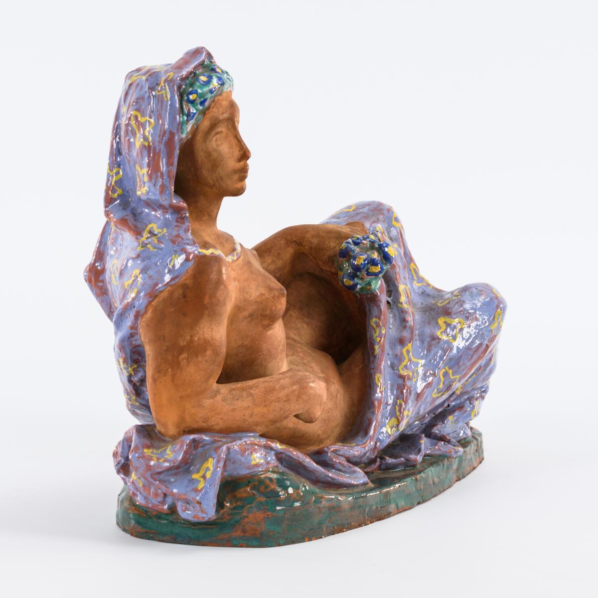 Teils in ein violettes Tuch gehüllter weiblicher Akt mit blauen Blumen, auf grünem Ovalsockel. Partiell leicht bestoßen, linke Zehen geklebt.