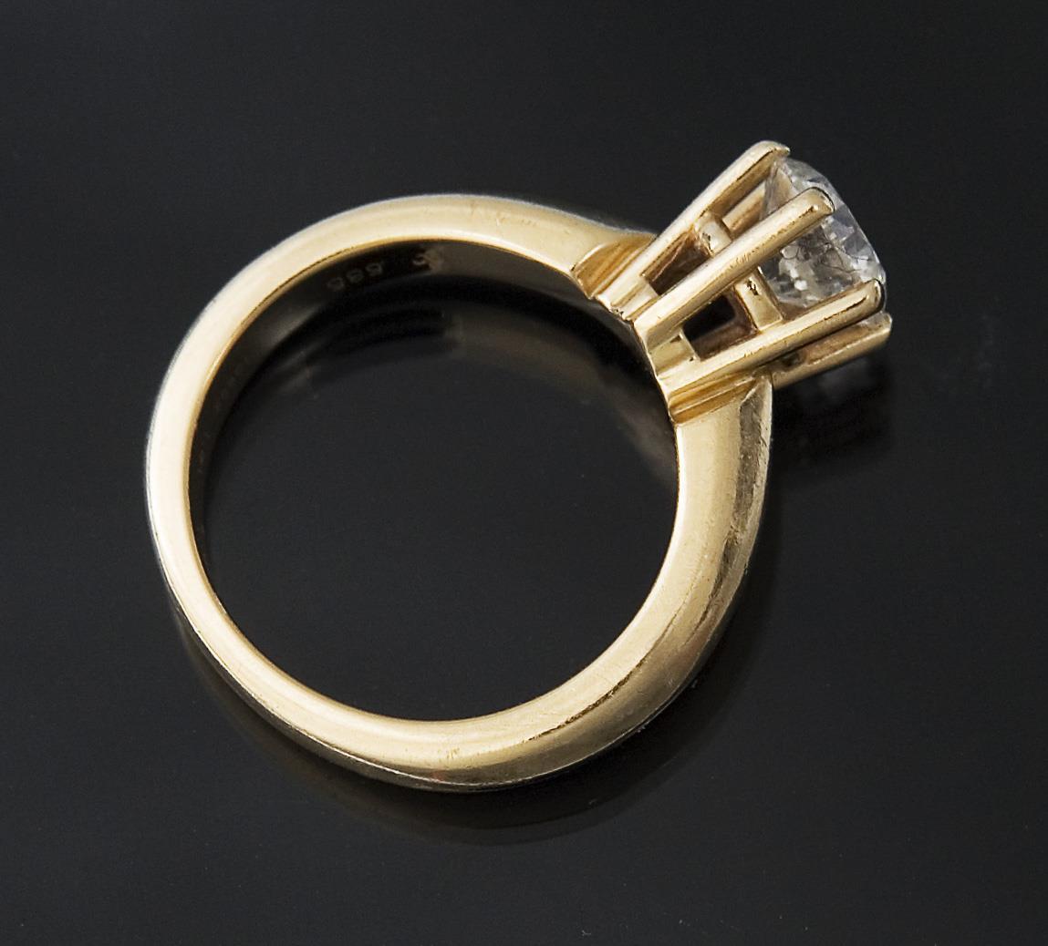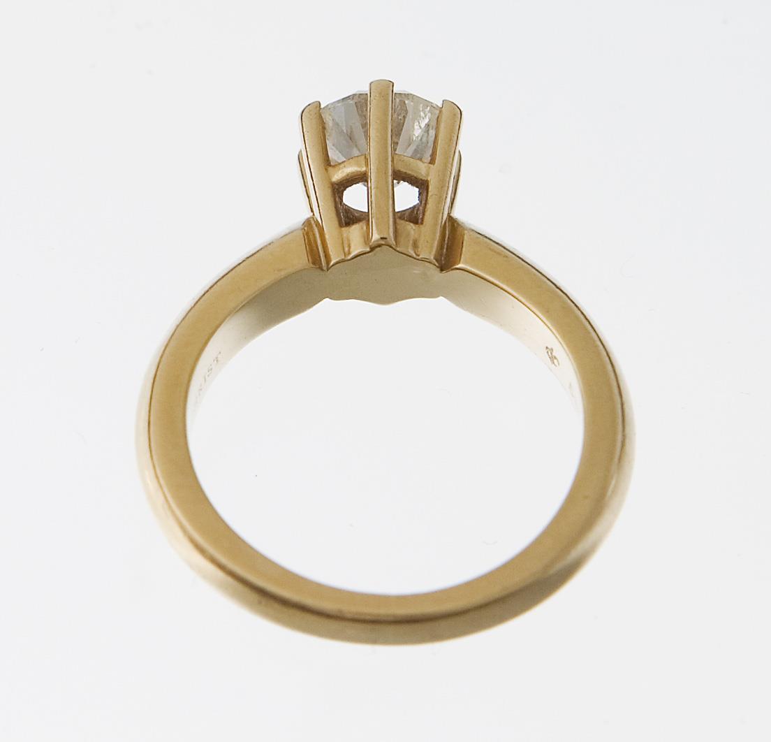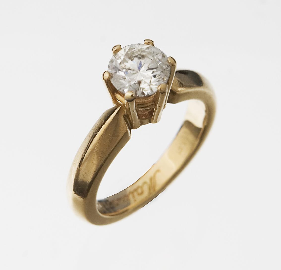 Brillant in Krappenfassung 1,01 ct, Reinheit P 1, Farbe Weiß H, Schliff sehr gut, Proportionen sehr gut, Fluoreszenz leicht. Stabile volle Schiene, Punzen: Gold-Feingehalt, Brillant-Karat, Idar-Oberstein-Nr. G1 013692, Namenszug Maiwand, Juweliermarke.