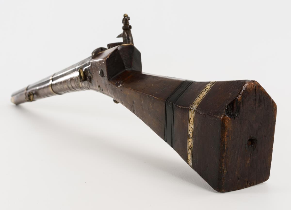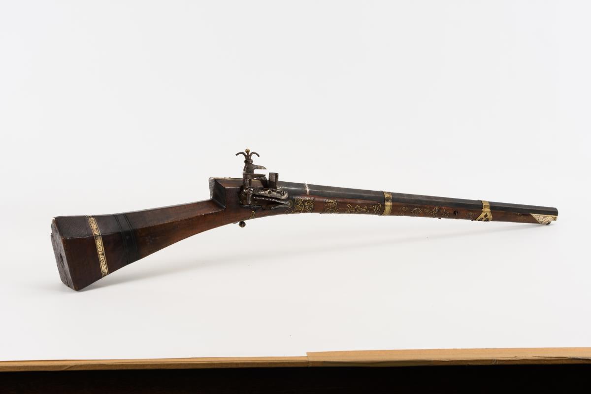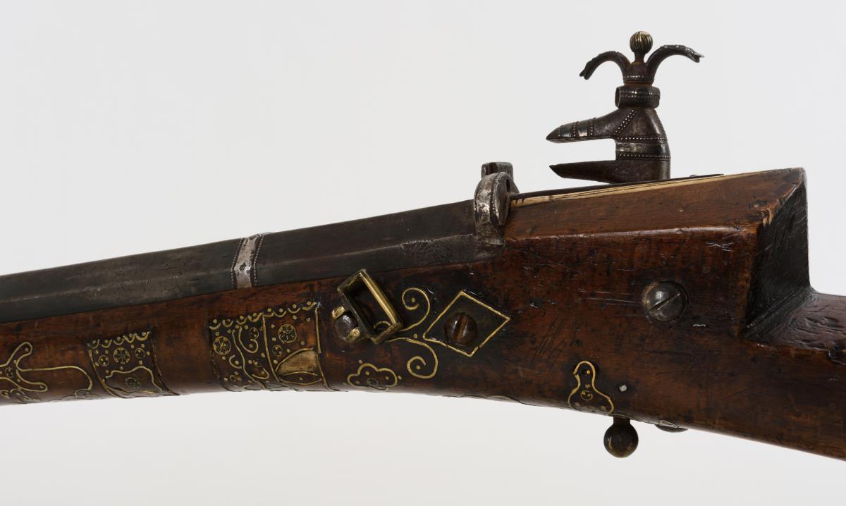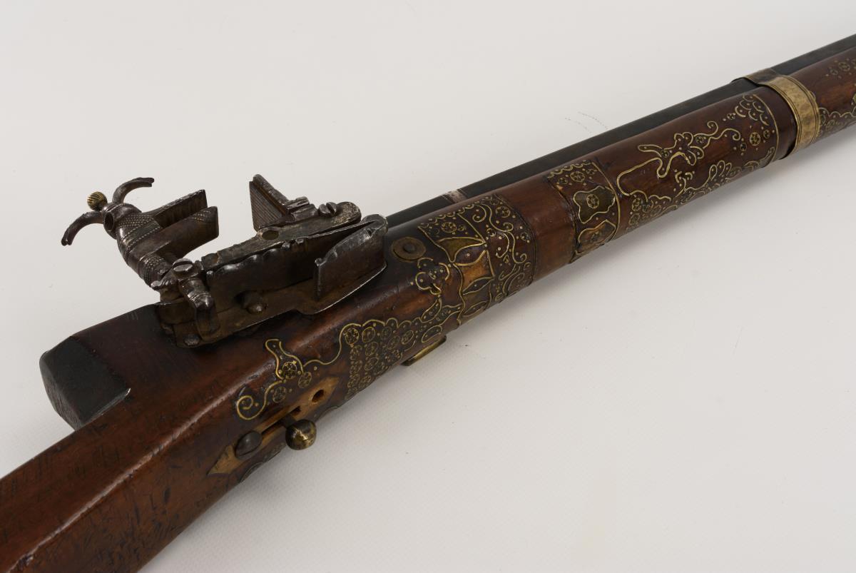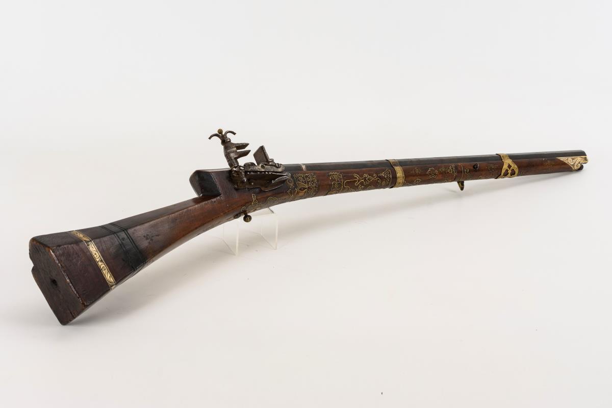 Achtkantiger Lauf, reich mit Messingeinlagen verziert. Gravierte Verbeinung, Ladestock aus Eisen. Einige Fehlteile der Verzierungen. Haltebänder für den Lauf ergänzt, kein Korn, Mechanik funktioniert nicht, Alters-/Gebrauchsspuren.