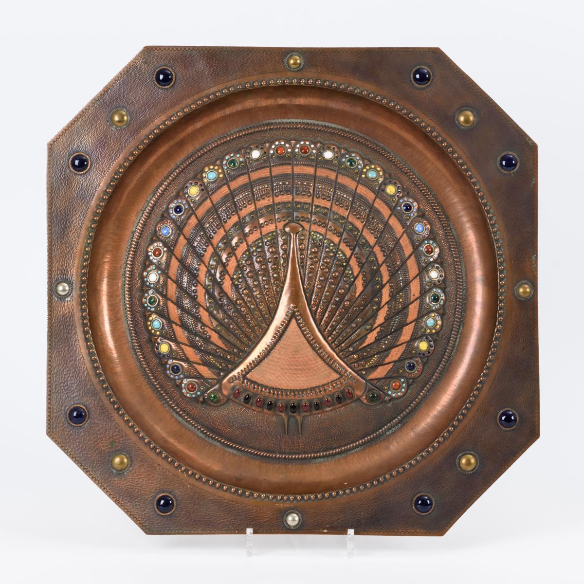 Kupfer getrieben und punziert, teils emailliert, Cabochons mit buntem Glassteinen. 50 x 50 cm.