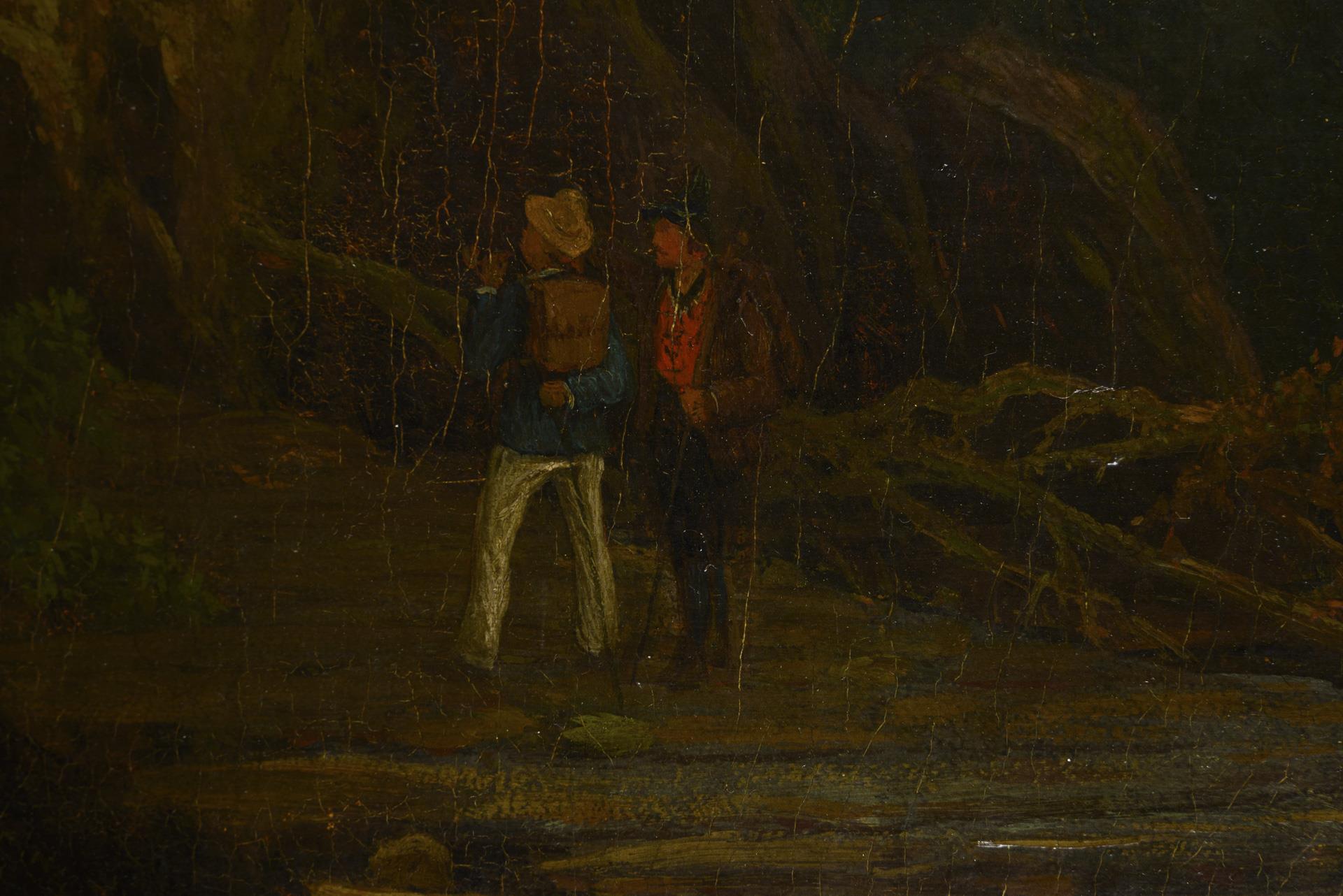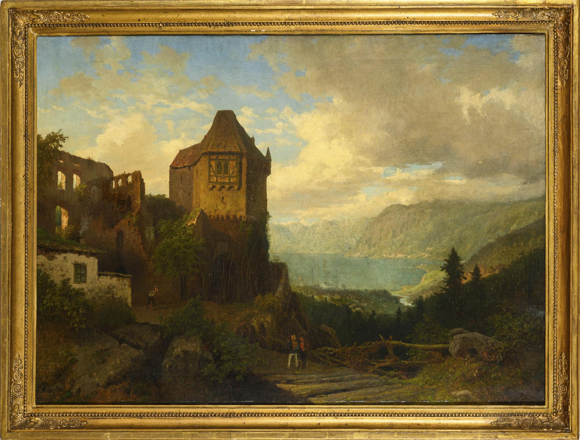 Staffagefiguren auf einer Brücke vor einer Burgruine auf einem Berg mit Blick hinunter ins Tal zum See. Eine kleine restaurierte Stelle mit Hinterklebung.