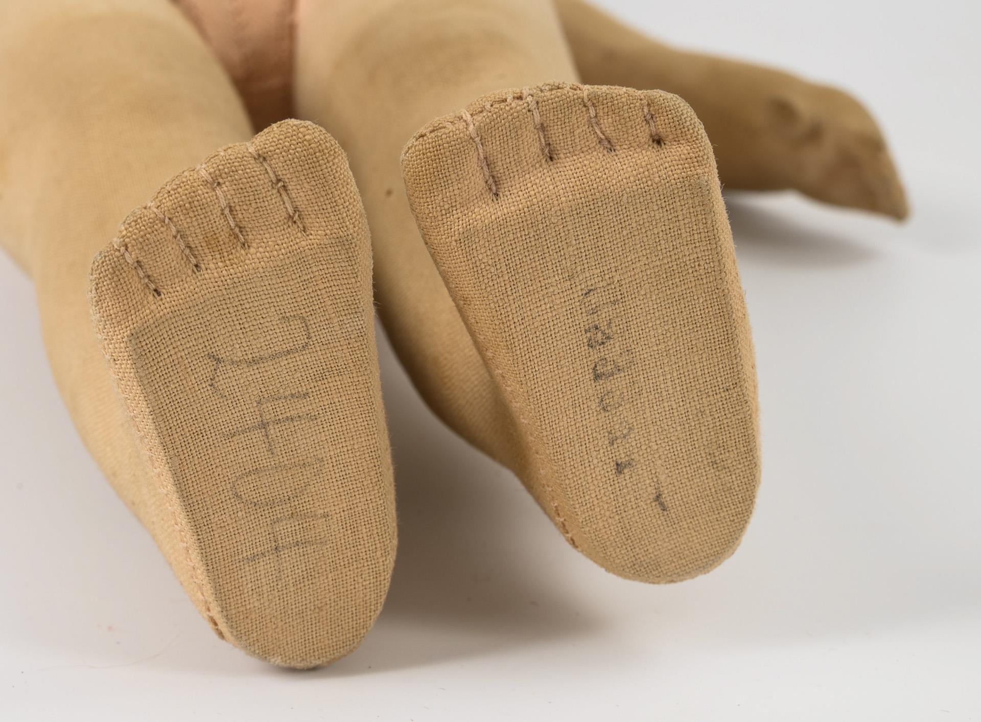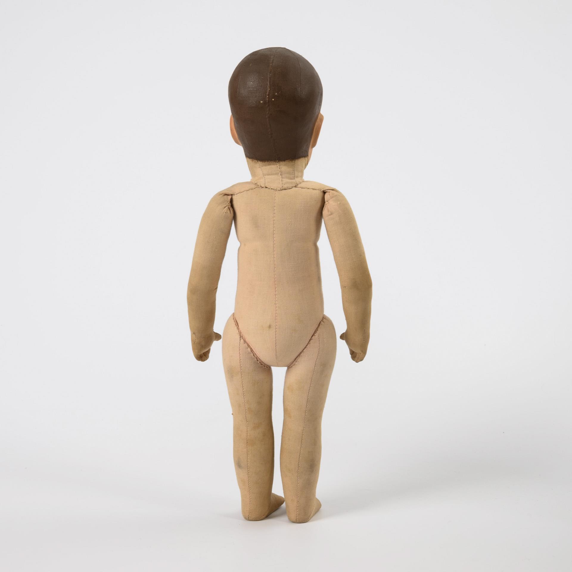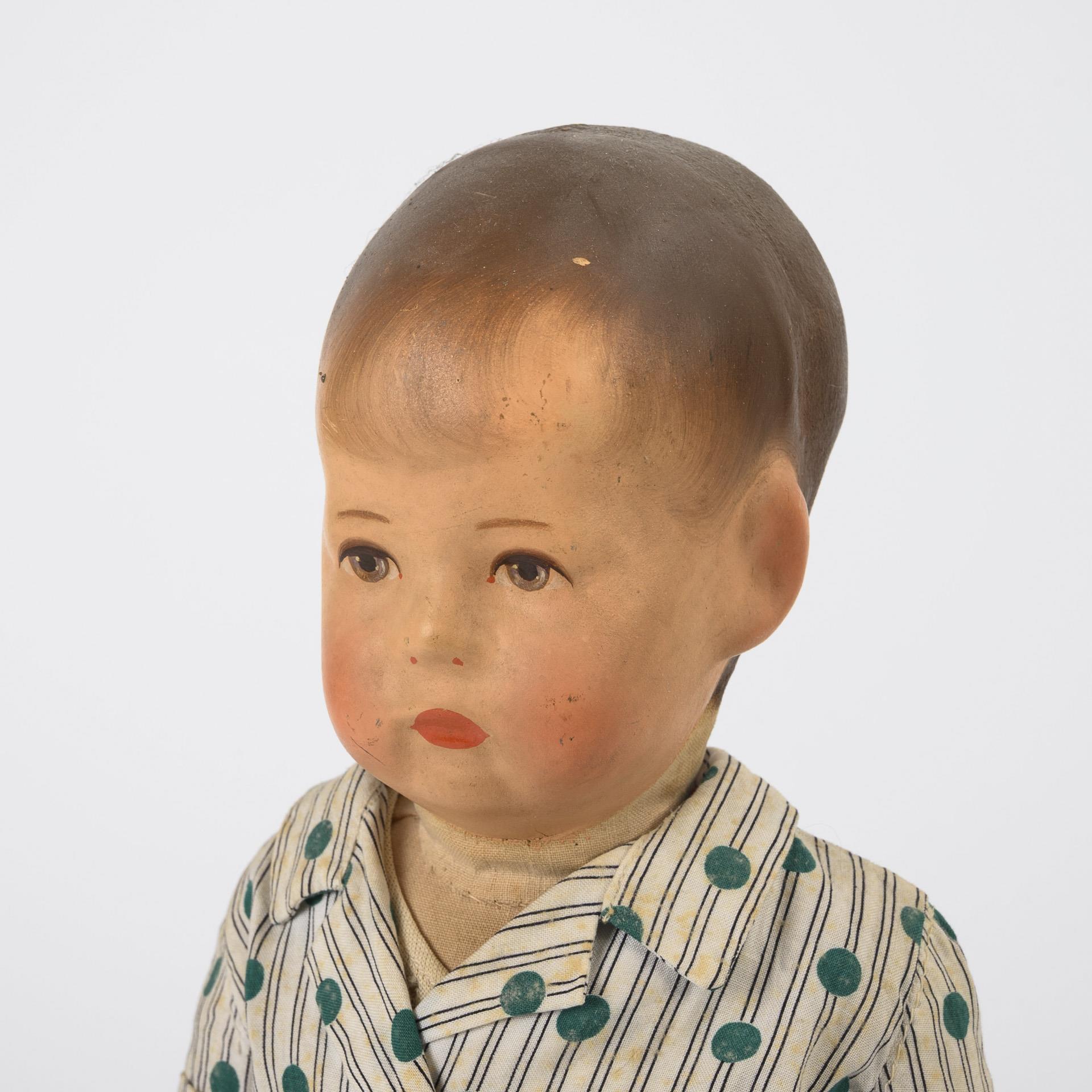 Maskenartig bemalter Stoffkopf mit 3 Hinterkopf-Nähten. Schlanker Stoffkörper. Kurzer Schlafanzug mit grünen Punkten. Mund retuschiert, Körper etwas fleckig.