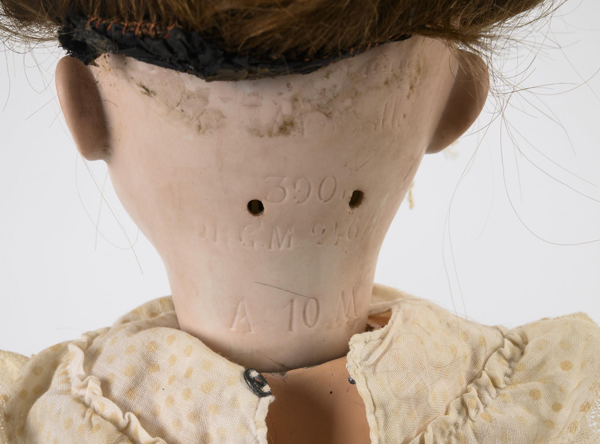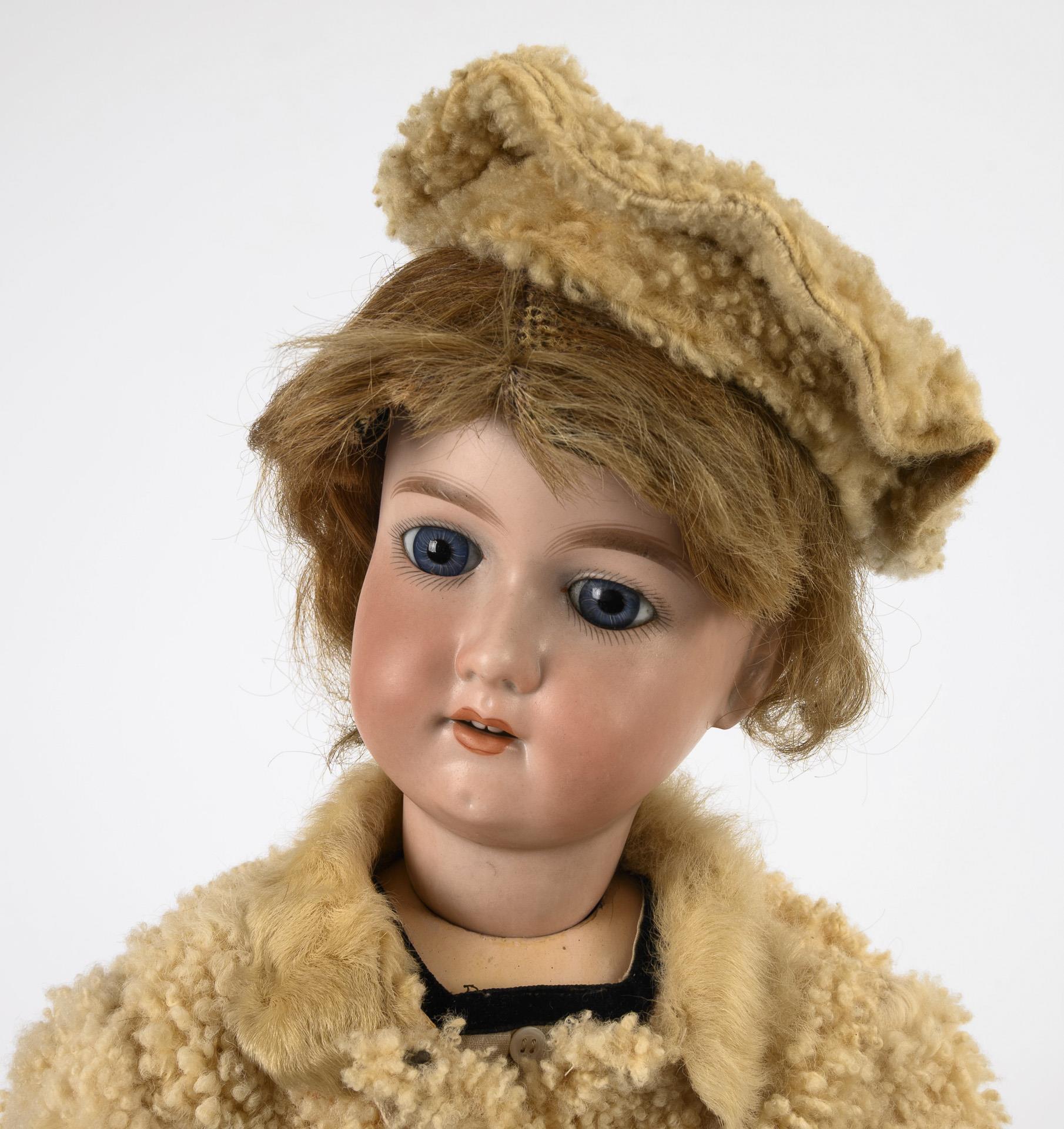 Jeweils Kurbelkopf, blaue Schlafaugen, Echthaarperücke, 15-teiliger Gliederkörper, helle Kleidung. 1x mit Zöpfen und weißem Kleid. Perücke fest: Kopf nicht durchleuchtet, Körper mit Defekten, L 63 cm. 1x mit cremefarbener Winterjacke, passender Mütze und Muff. Kopf durchleuchtet: ohne Risse, lediglich minimaler Perückenpull, L 58 cm.