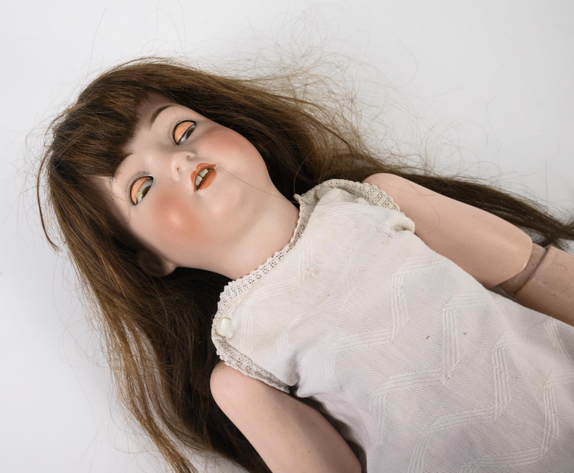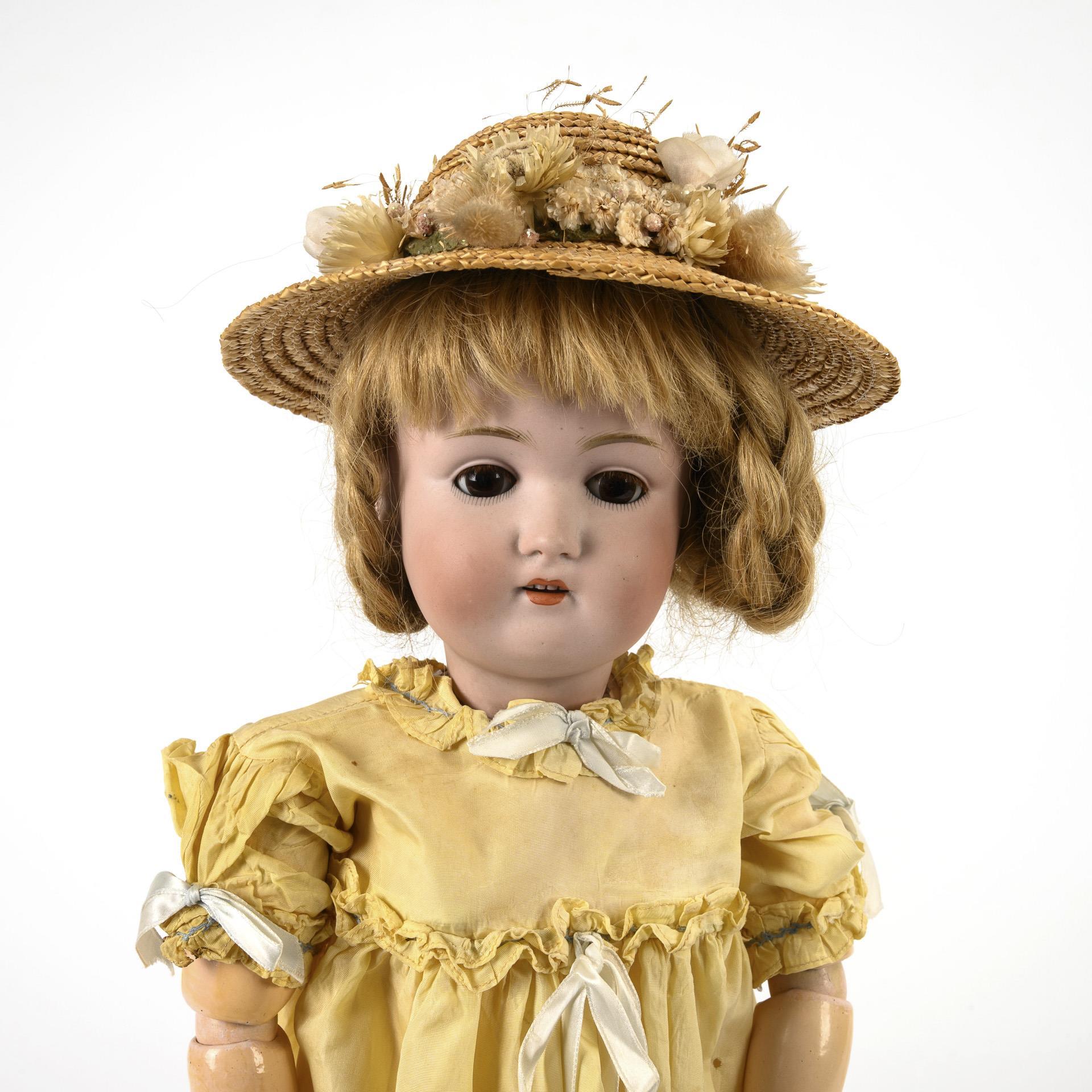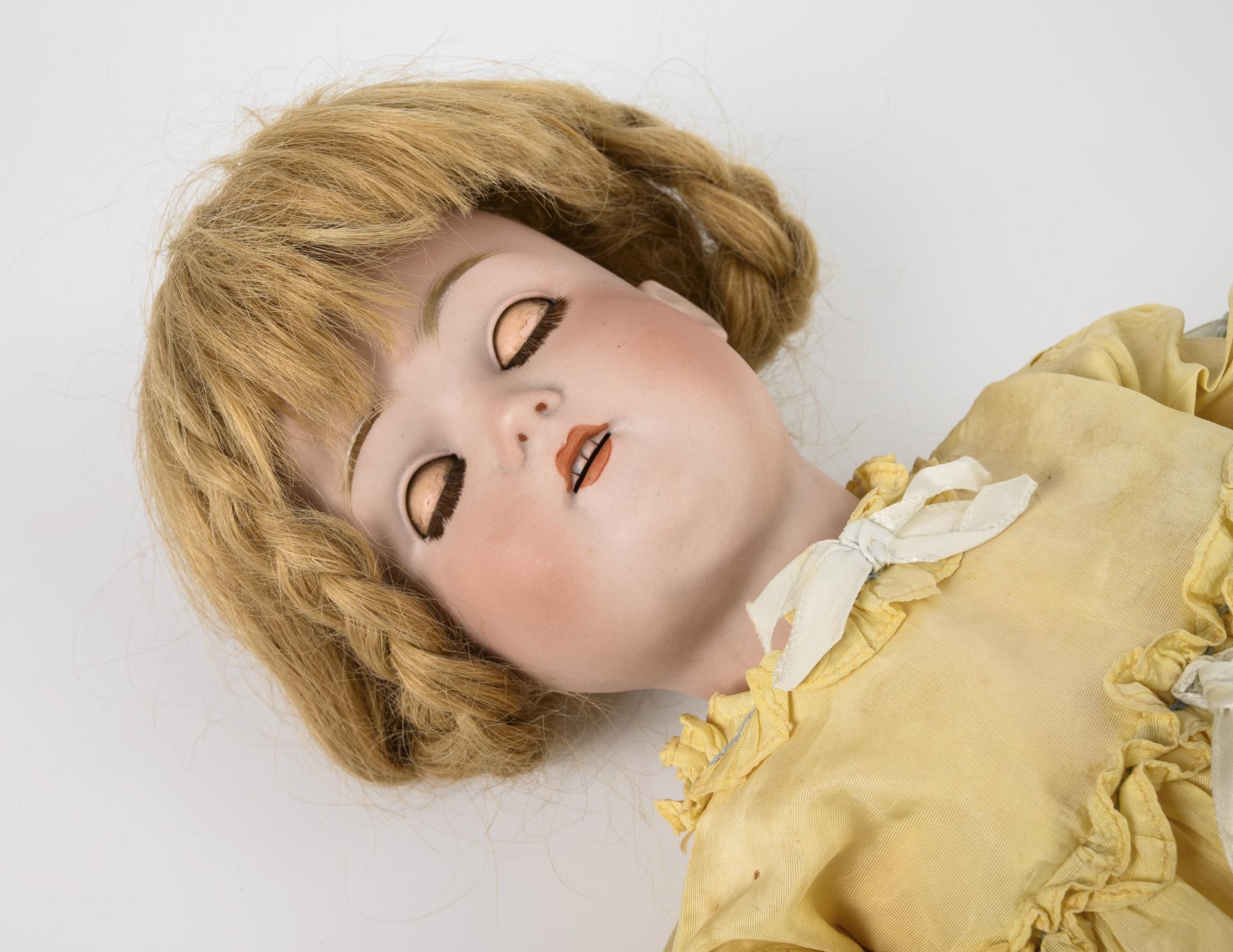 Beide mit Kurbelkopf, braunen Schlafaugen, Echthaarperücke und 15-teiligem Gliederkörper. Blonde Kestner-Puppe (168) mit gelbem Kleid und Strohhut, L 60 cm. / Kämmer & Reinhardt-Puppe (K & R Simon & Halbig X) mit langer brauner Perücke und weißem Nachthemd. L 58 cm. Köpfe durchleuchtet: ohne Defekte.