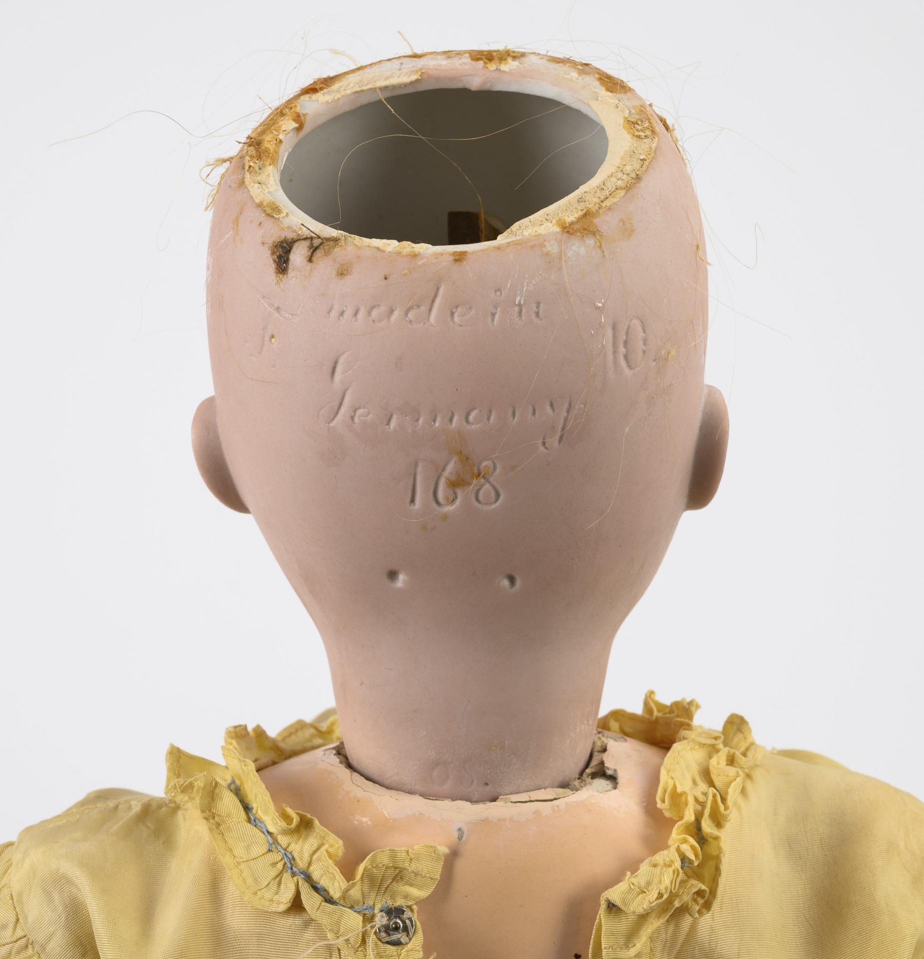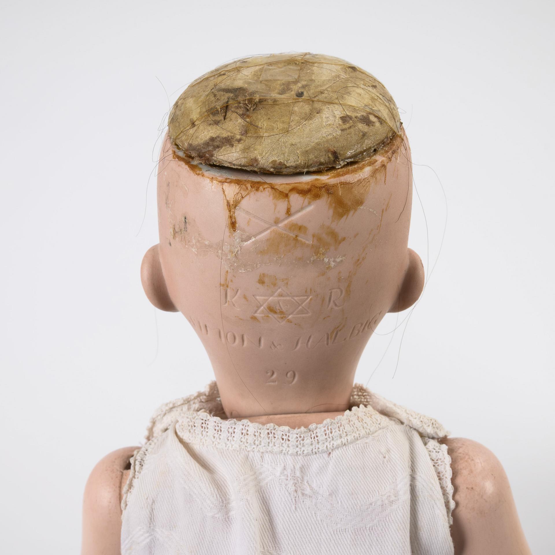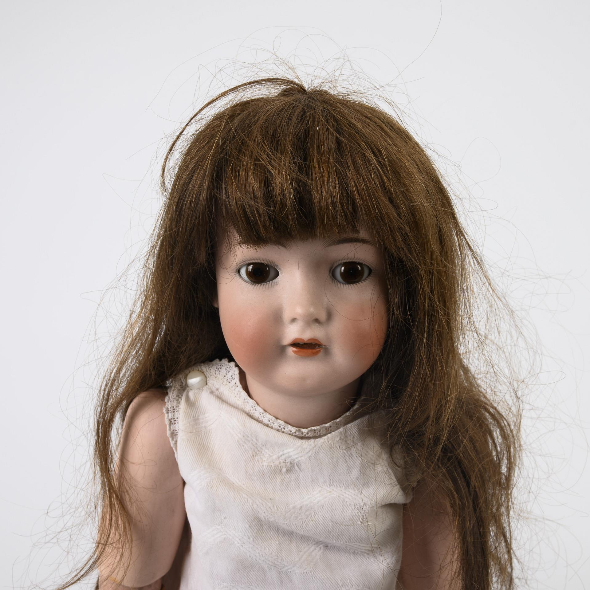 Beide mit Kurbelkopf, braunen Schlafaugen, Echthaarperücke und 15-teiligem Gliederkörper. Blonde Kestner-Puppe (168) mit gelbem Kleid und Strohhut, L 60 cm. / Kämmer & Reinhardt-Puppe (K & R Simon & Halbig X) mit langer brauner Perücke und weißem Nachthemd. L 58 cm. Köpfe durchleuchtet: ohne Defekte.