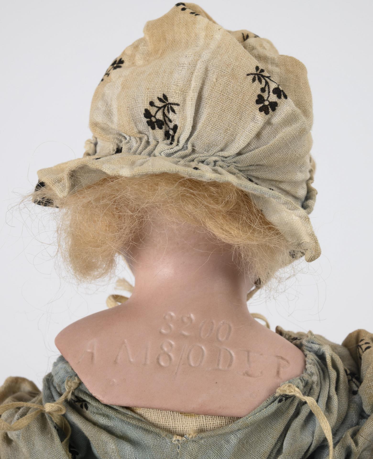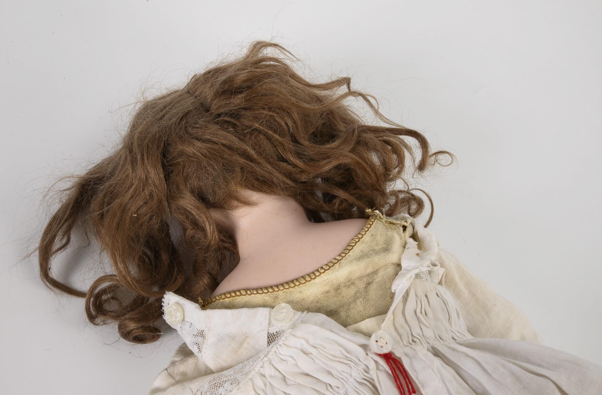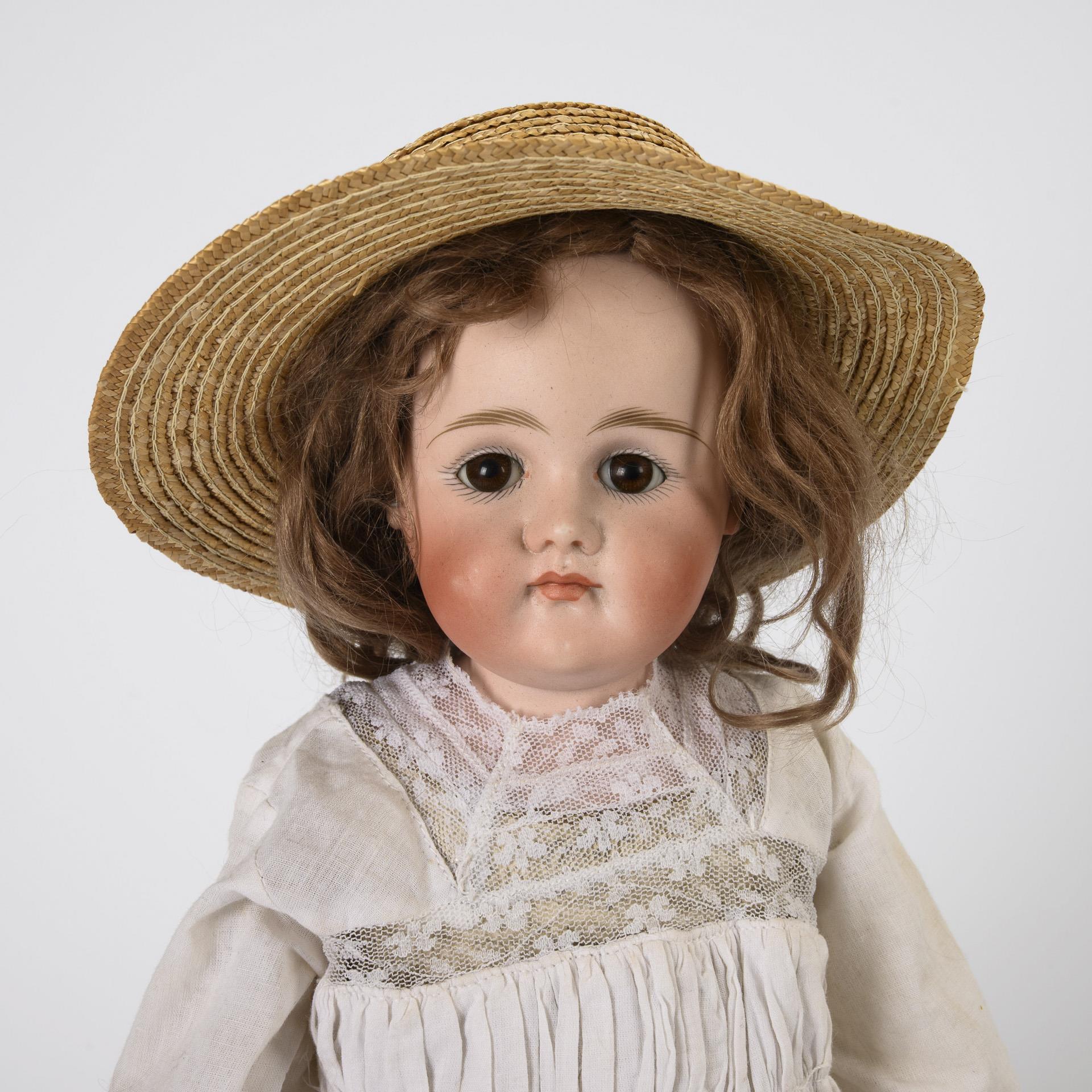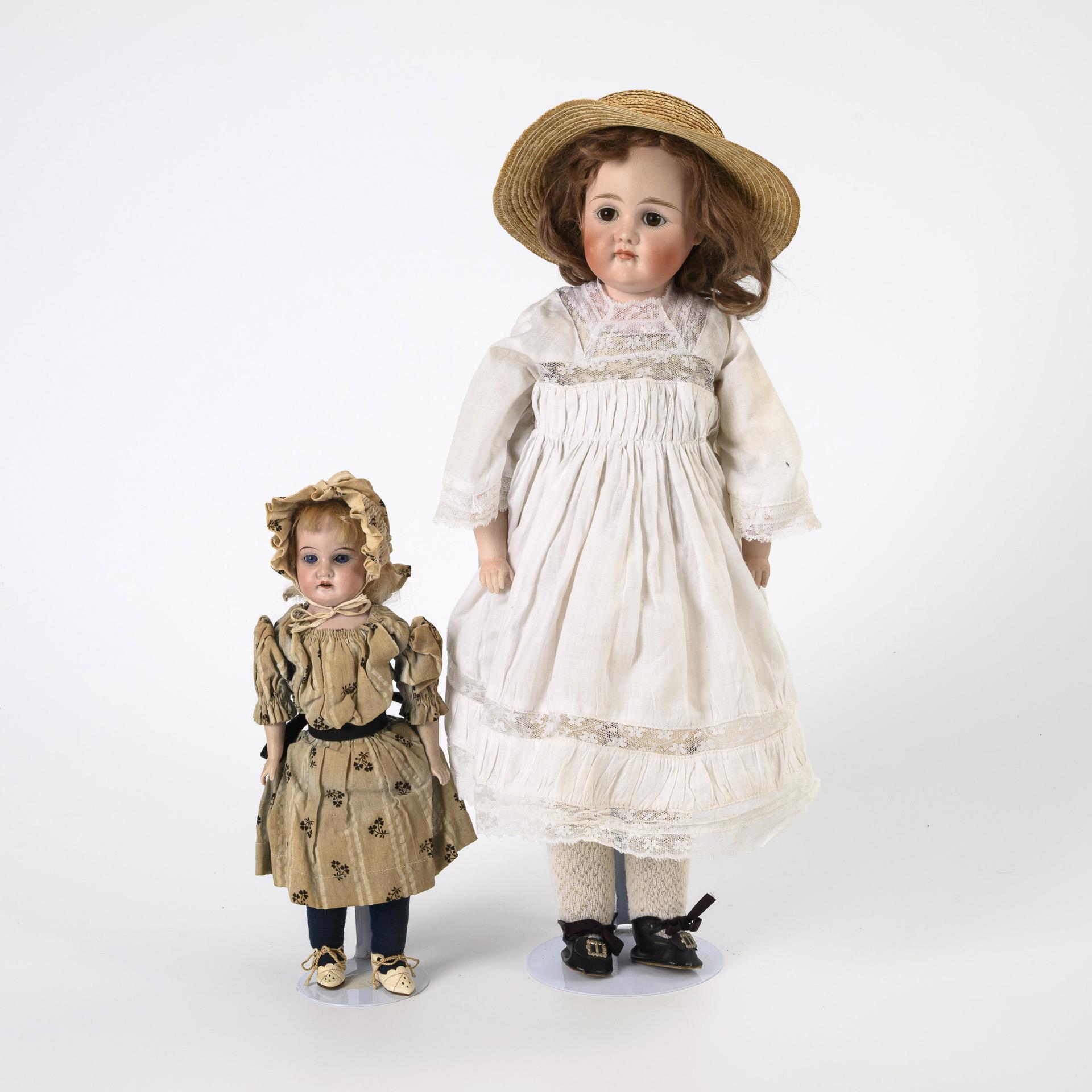1x mit festen braunen Glasaugen, hellbrauner Mohairperücke, Lederkörper mit Biskuitunterarmen und Kniegelenken. Weißes Kleid und Strohhut. Kopf durchleuchtet: ohne Defekte. L 49 cm. / 1x mit blauen Schlafaugen, blonder Mohairperücke, Stoffkörper, hellem Kleid und festen blauen Stümpfen. Rechter Augenwinkel mit kleinem Haarriss, Brandriss im Mundwinkel, minimaler Chip am rechten Daumen. L 27 cm.