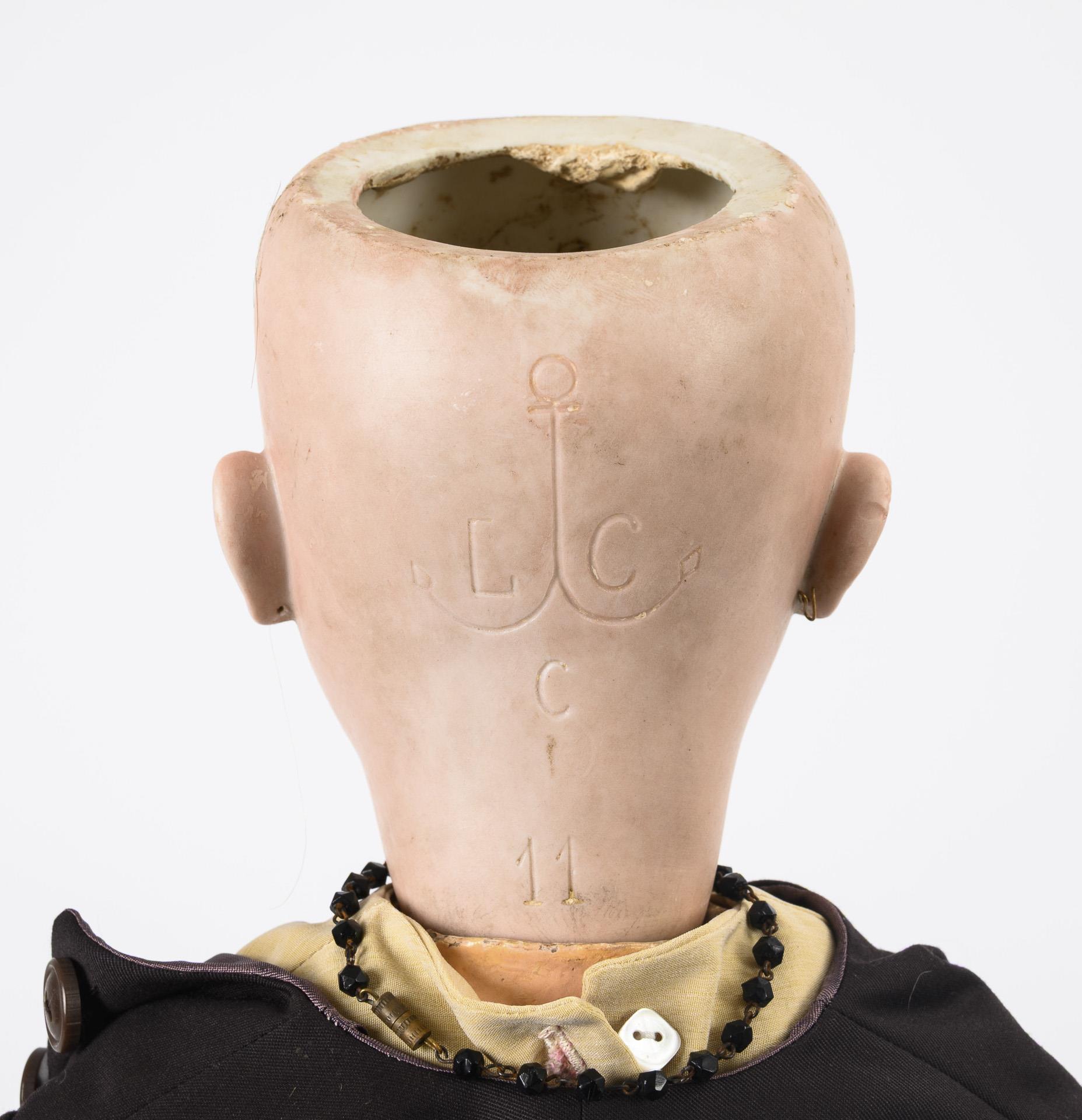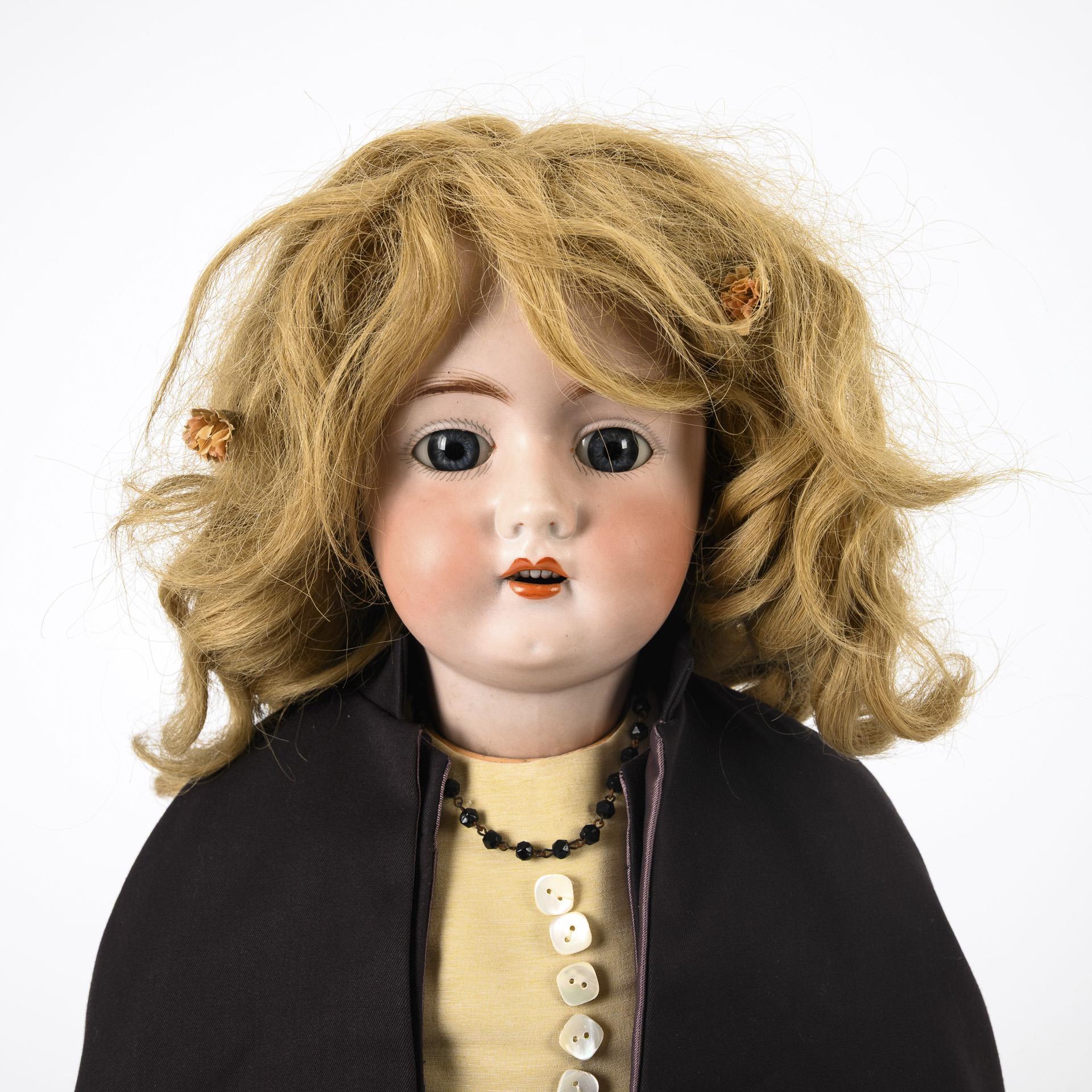 Kurbelkopf, festgegipste blaue Augen, Ohrringe, blonde Echthaarperücke. 13-teiliger Gliederkörper. Cremefarbenes Kleid in alter Art, brauner Mantel, passendes Cape, schwarze Lederschuhe. Kopf durchleuchtet: ohne Risse, lediglich einige winzige Chips. Hände mit Farbabplatzern.