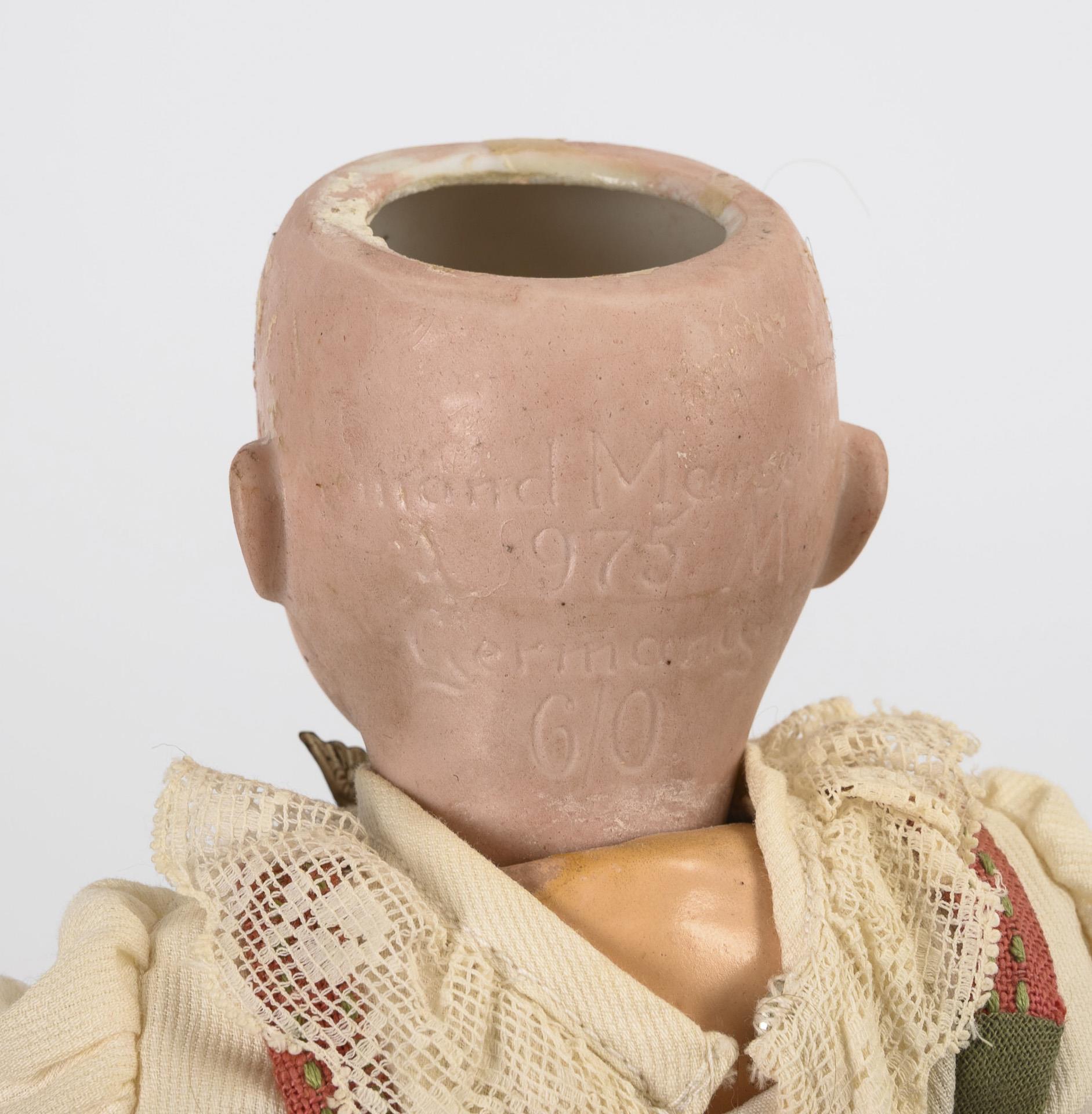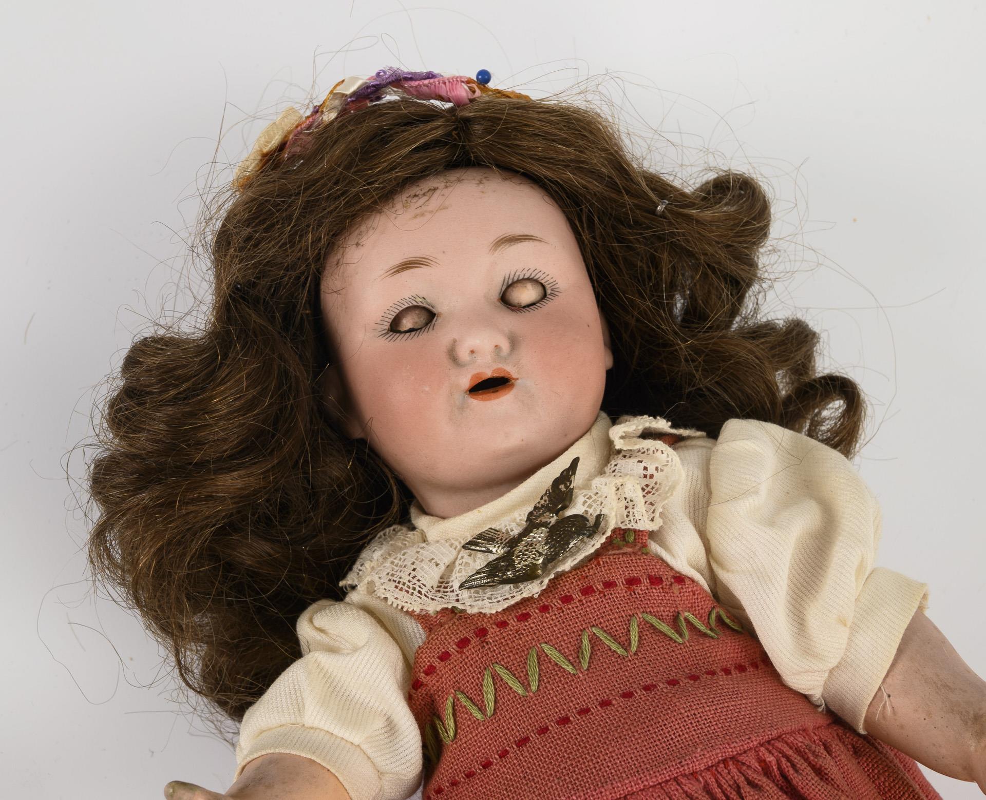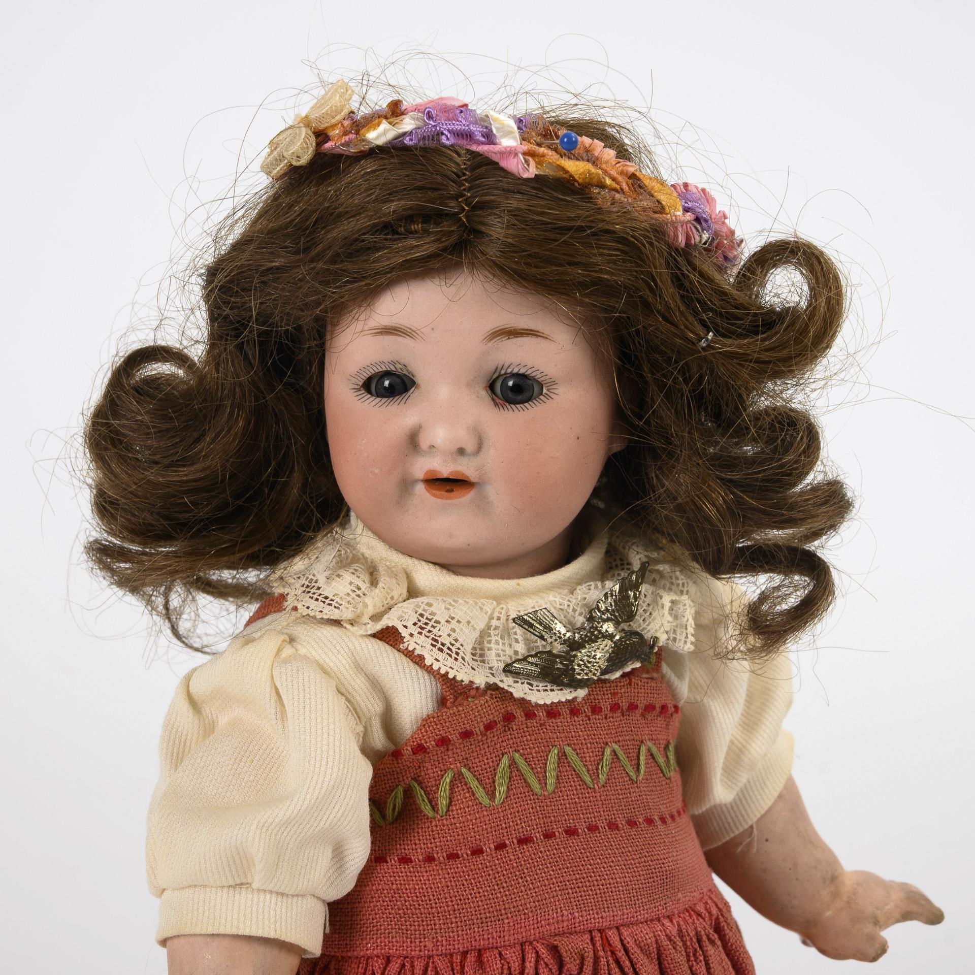 Kurbelkopf, blaue Schlafaugen, offener Mund, gelockte braune Echthaarperücke. 5-teiliger Stehpuppenkörper mit abgespreizten Händen in Googly-Art. Rotes Kleid, Haarkranz, alte schwarze Schuhe. Kopf durchleuchtet: ohne Defekte.