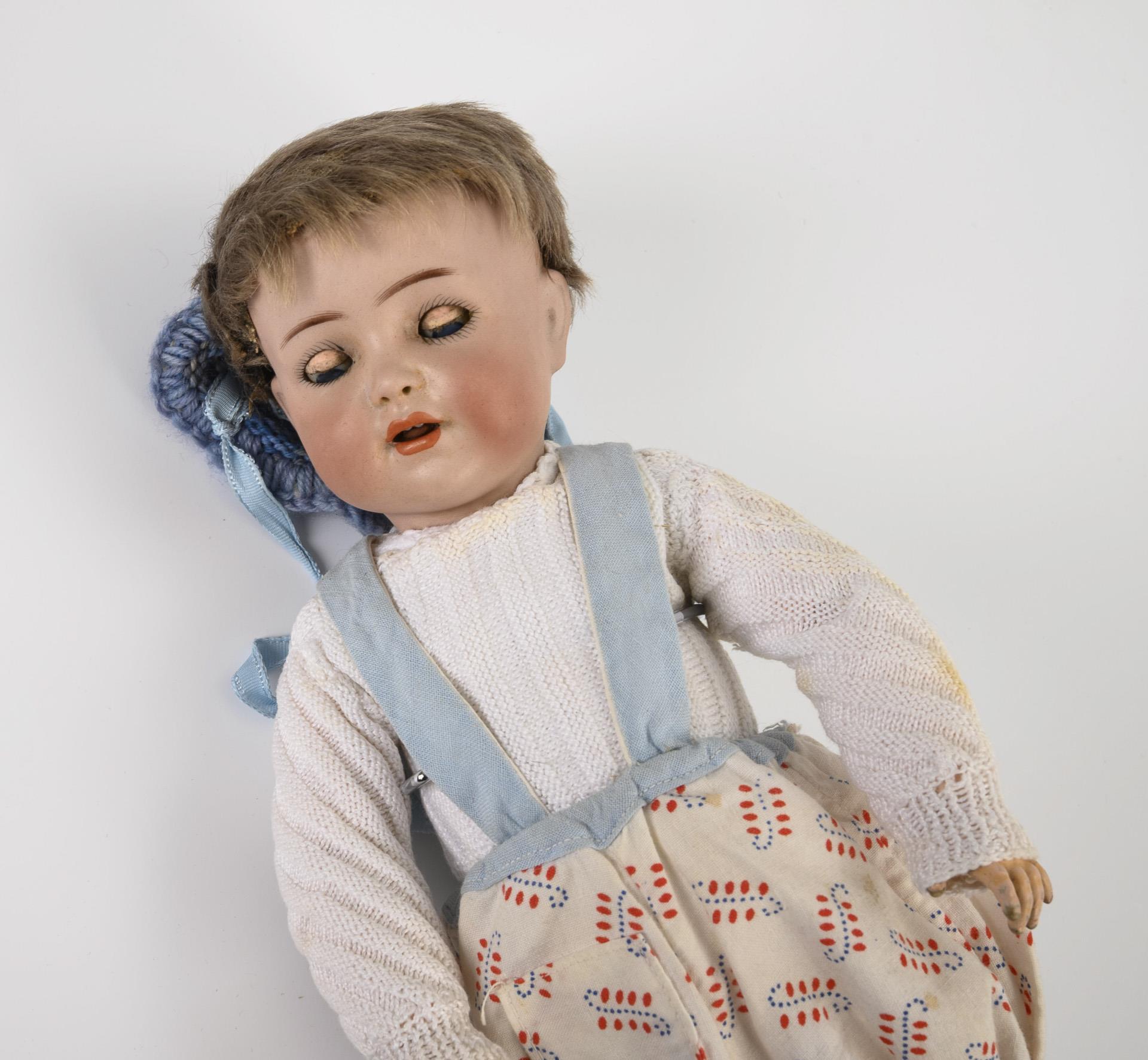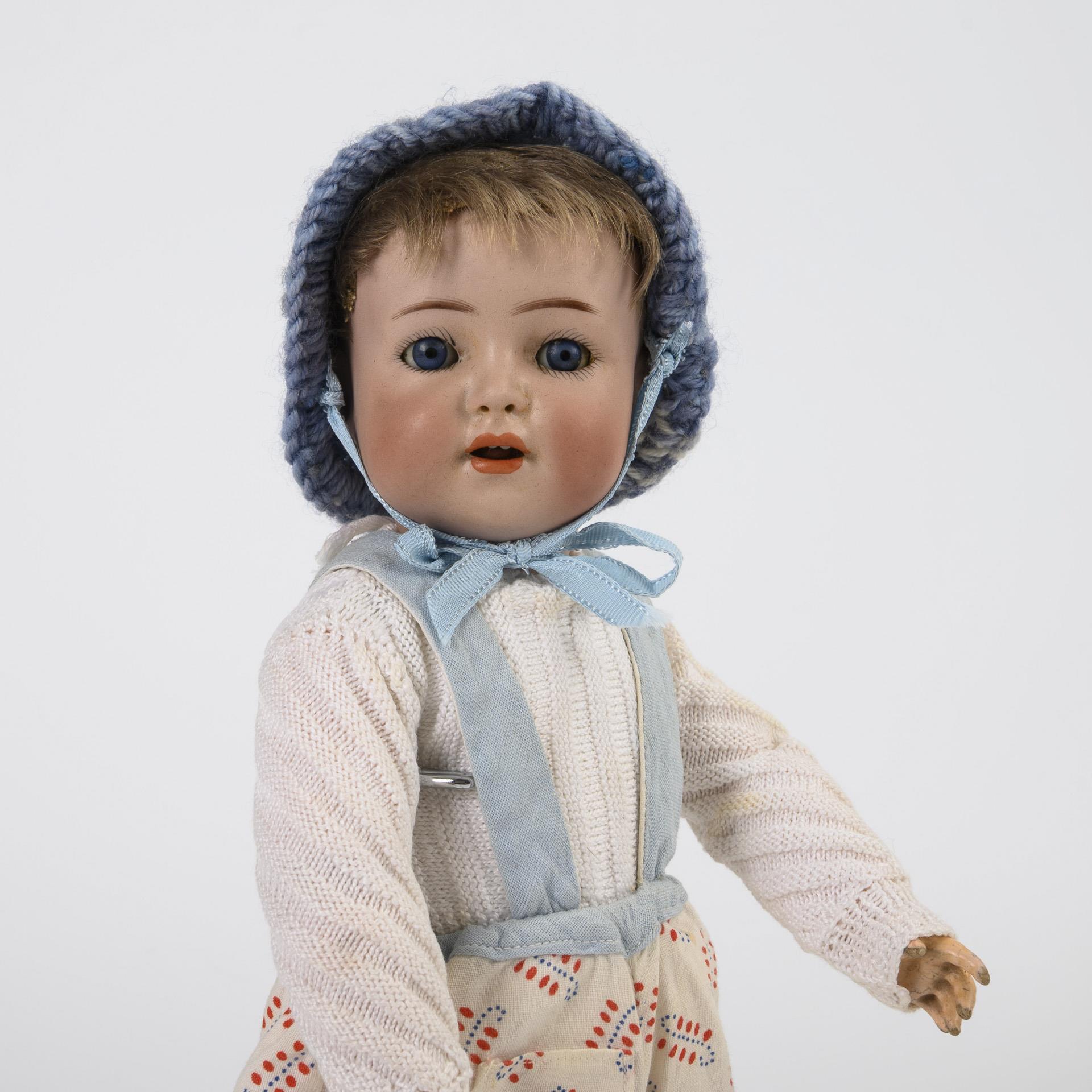 Kurbelkopf, blaue Schlafaugen, offene Nasenlöcher, hellbraune Fellperücke. 15-teiliger Toddlerkörper. Kurzes Spielhöschen, blaue Strickmütze, rote Schuhe. Kopf durchleuchtet: ohne Defekte, 1 Finger repariert.