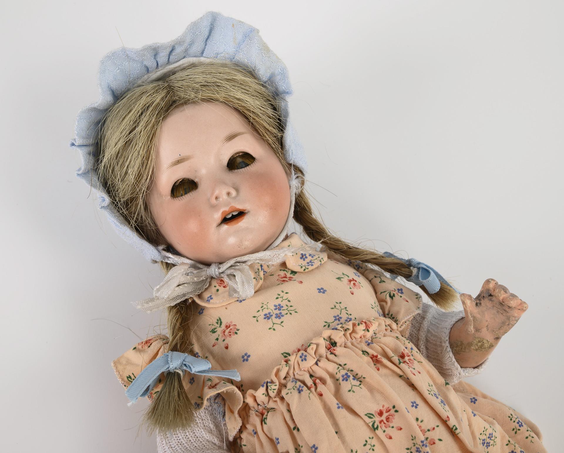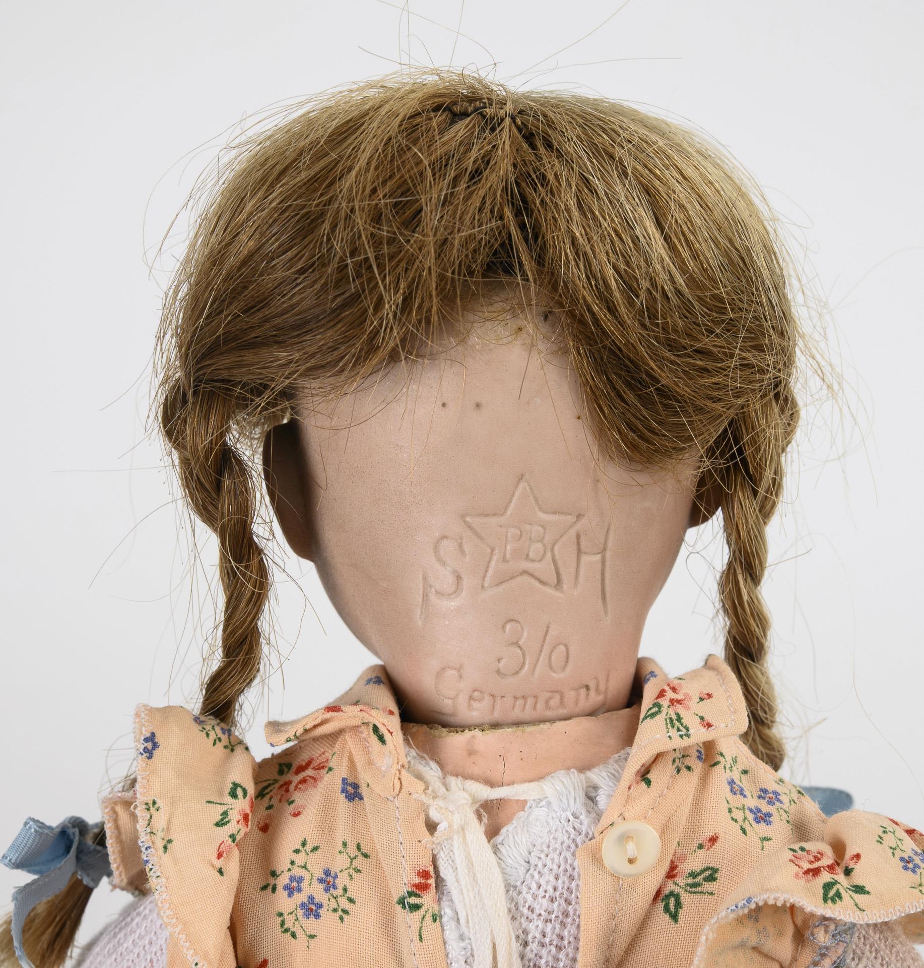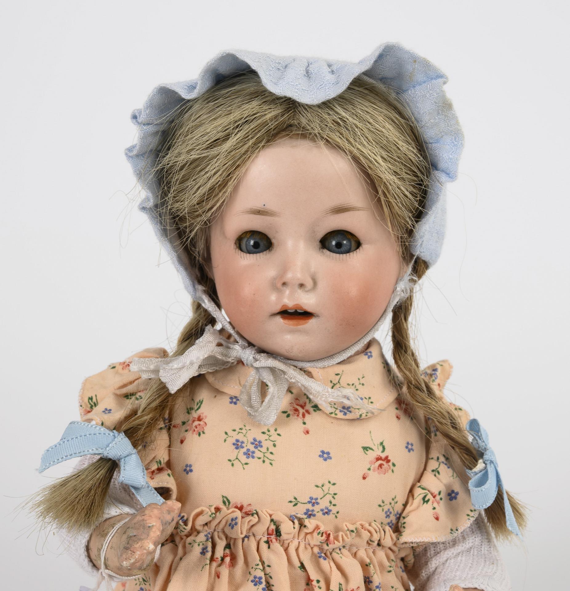 Kurbelkopf, blaue Schlafaugen, Wimpern, blonde Echthaarperücke mit geflochteten Zöpfen, 5-teiliger Sitzbabykörper, rosa Kleid mit Blumendruck, hellblaue Häkelschuhe. Kopf durchleuchtet: ohne Defekte. Körper mit Farbabrieb, 1 Finger repariert, 1 Zeh bestoßen.