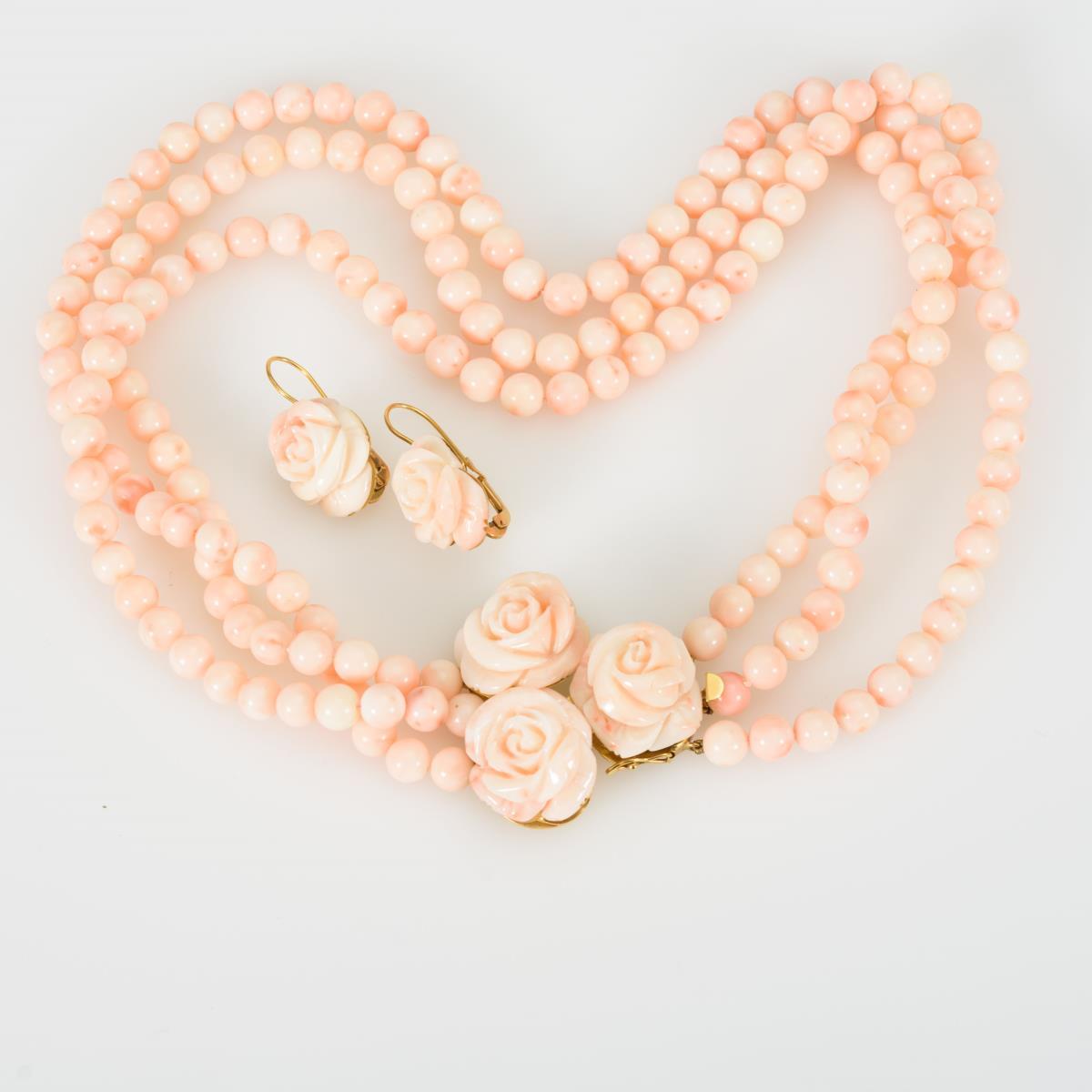 3-reihige Halskette und Ohrhängerpaar mit Engelshautkorallen.