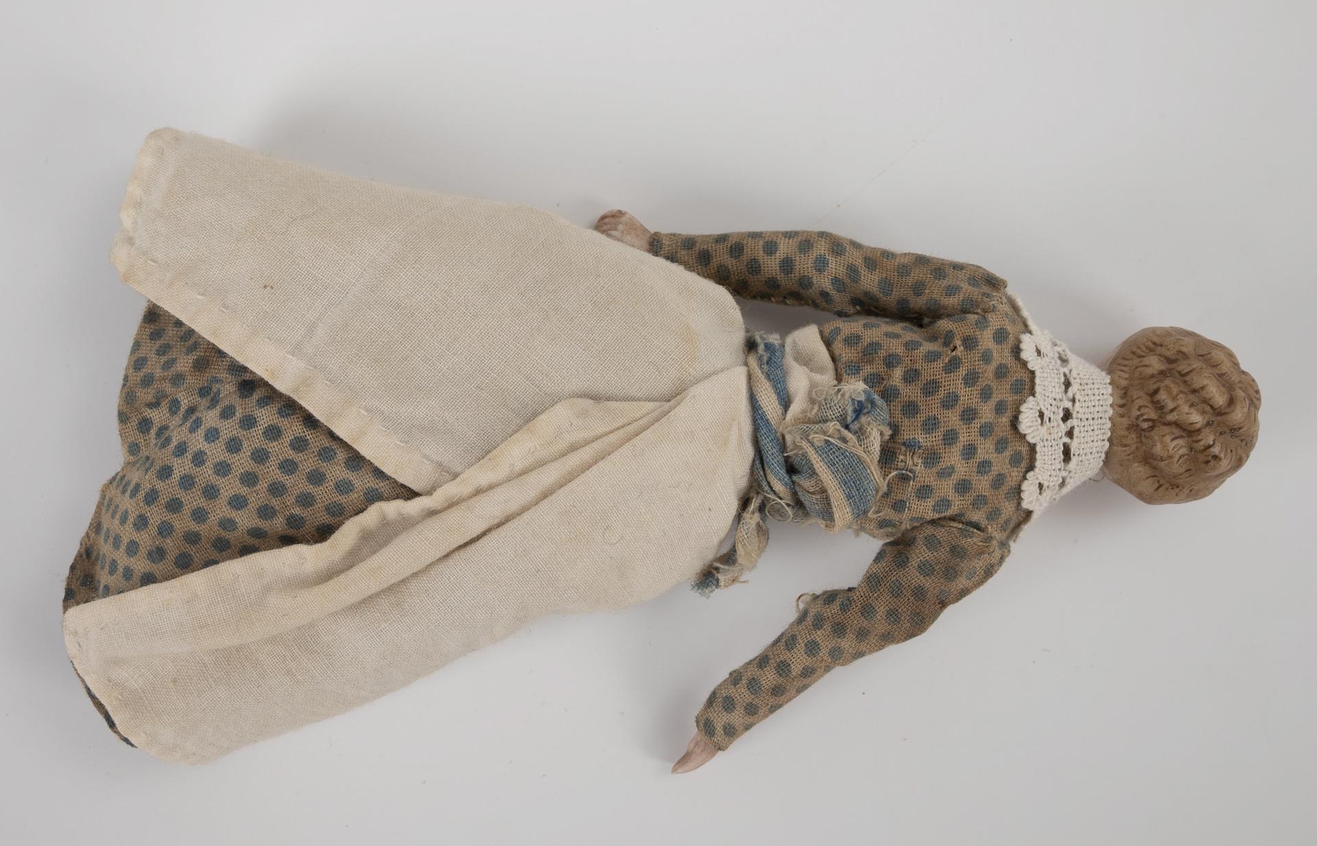 Kleine Brustkopf-Puppe mit modellierten Haaren. Als Dienstmädchen bekleidet, mit weißer Schürze. L 16 cm. / Waschtisch mit passend ergänztem Spiegel, dazu Waschschüssel, Kanne und Nachttopf aus Porzellan. H 17,5 cm. Altersspuren, kleine Lackdefekte.