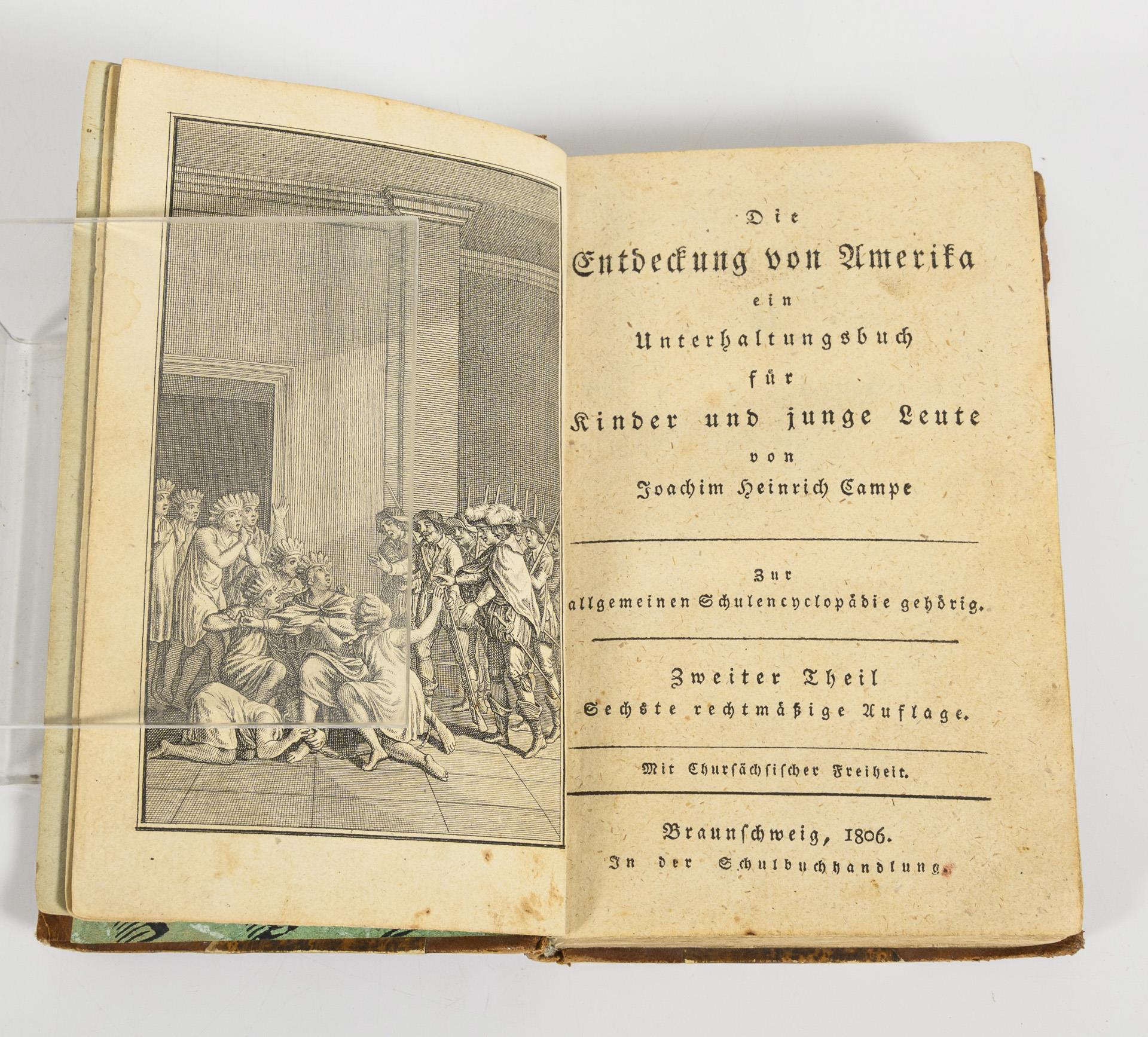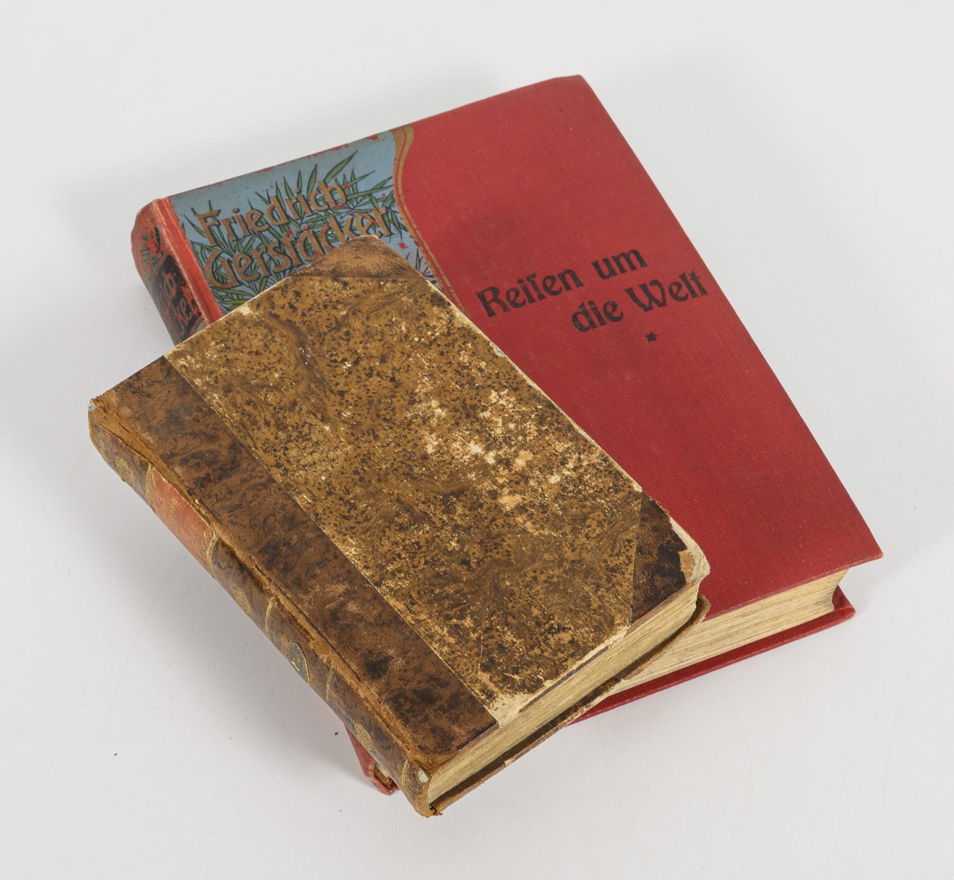 Campe, Joachim Heinrich: "Die Entdeckung von Amerika, ein Unterhaltungsbuch für Kinder ...", Zur allgemeinen Schulencyclopädie gehörig. Zweiter Teil, Sechste rechtmäßige Auflage. Braunschweig 1806, in der Schulbuchhandlung. 302 Seiten und eine Karte von Mexico oder Neu-Spanien. Halbledereinband, 14 x 9 cm. / Friedrich Gerstäcker: "Reisen um die Welt", 1. Band, neu durchgesehen und herausgegeben von Max Bauer. Verlag von Neufeld & Henius, 495 Seiten, im farbigen Leineneinband, 19 x 14 cm.