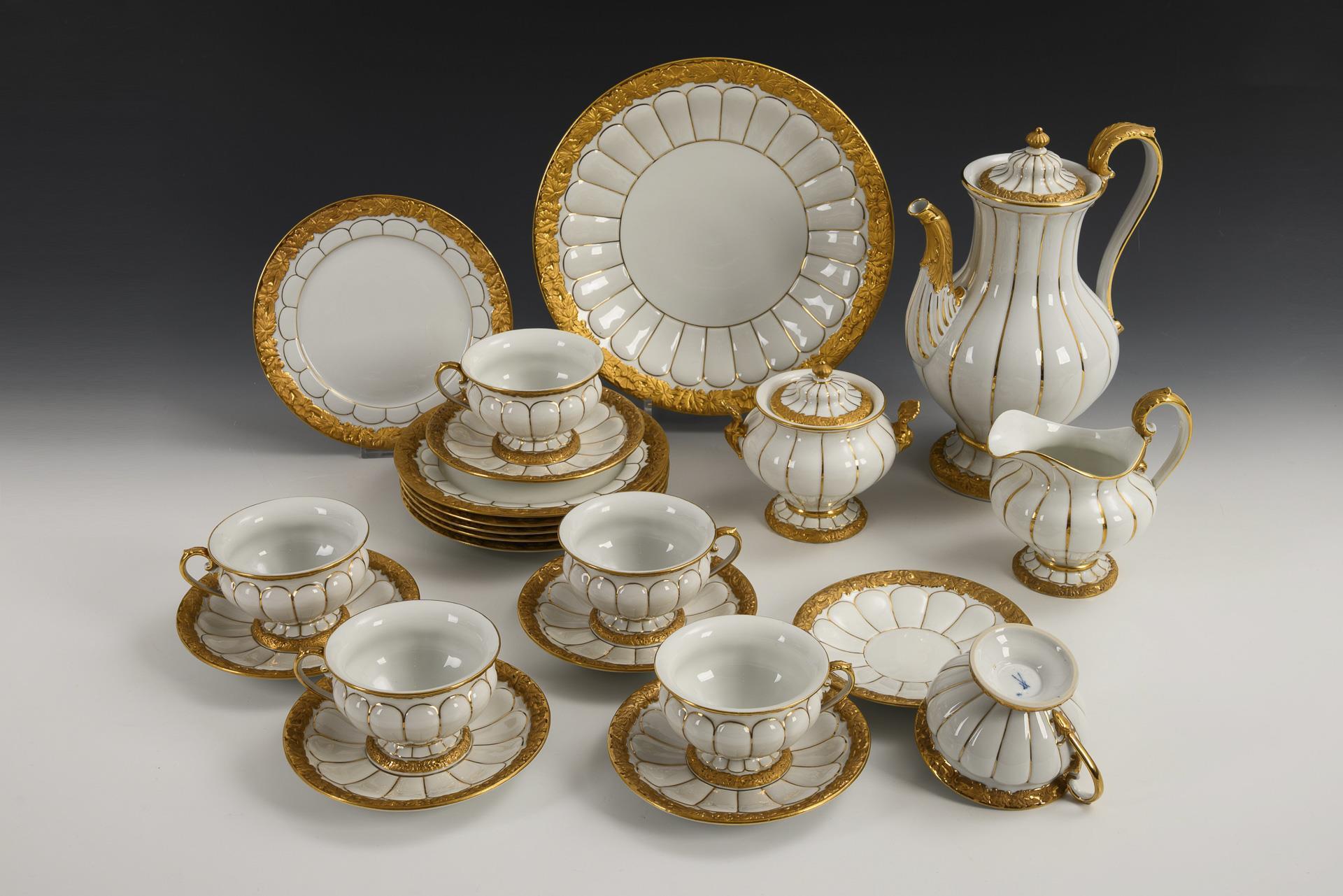 22 Teile. Kaffeekanne (H 26,5 cm), Milchkännchen, Zuckerdose, 6 Tassen, 6 Untertassen, 6 Kuchenteller und 1 Kredenzteller (Ø 27,5 cm). Haarriss in 1 Tassenhenkel.