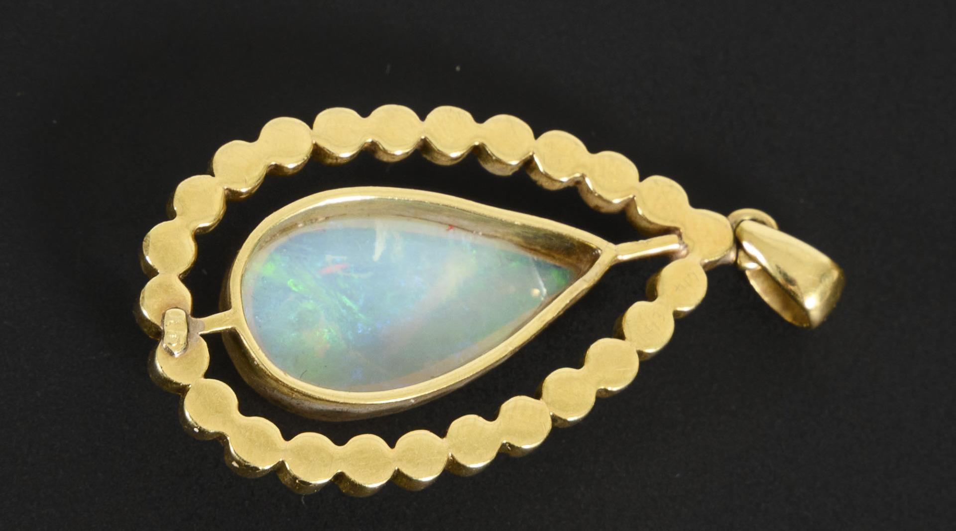 Gelbgold 15 [K] (625) gestempelt. Max. ca. 27,39 x 18,09 mm (ohne Öse gemessen), der Opal (in der Fassung gemessen) 16,58 x 8,60 mm. 3,9 g.