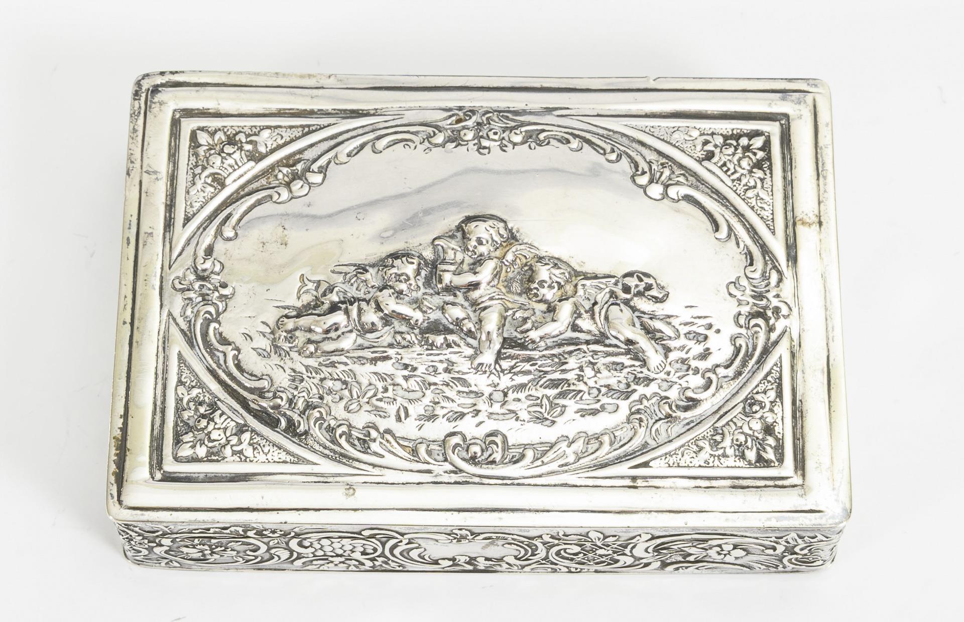 Rechteckiges Döschen mit Puttenmotiv auf dem Scharnierdeckel. Gebrauchsspuren.