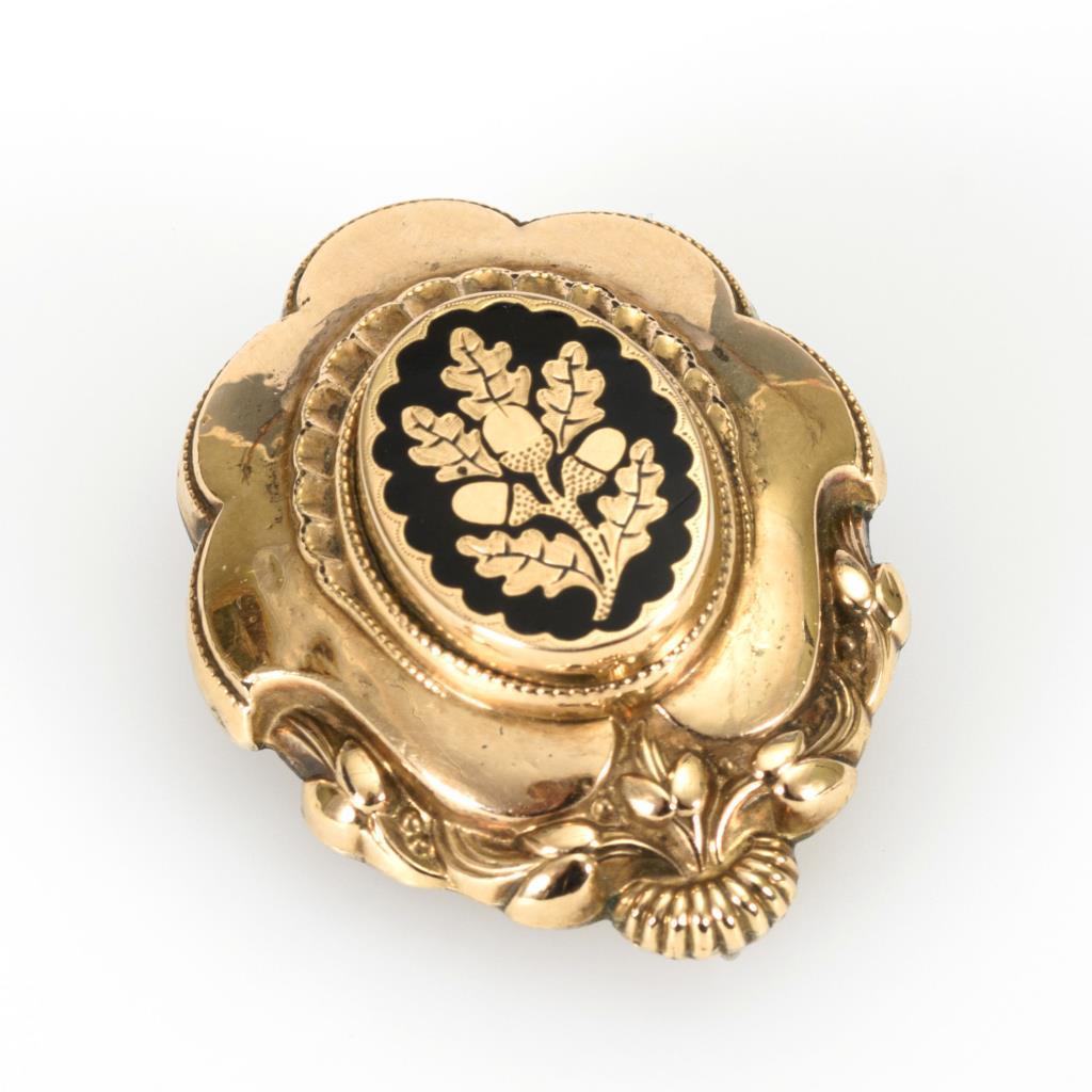 In Hohlform reliefierte Brosche mit Eichenlaubdekor und Schwarzemail. Hakenverschluss.