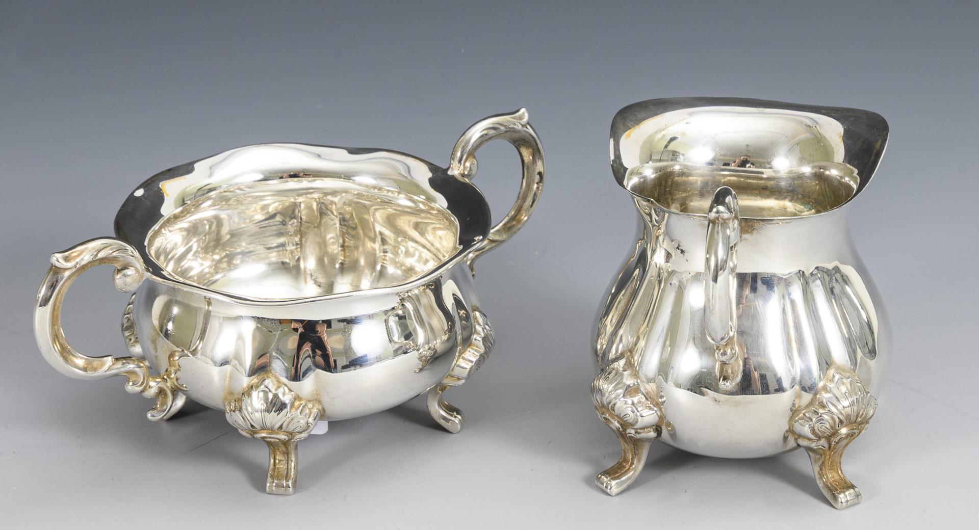 In neobarocker Formensprache gestalteter Sahnegießer und Zwei-Henkel-Zuckerschale, jeweils auf 4 Füßchen. Minimale Alters- und Gebrauchsspuren.