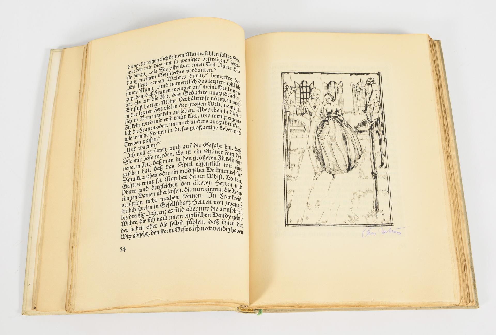Nummeriert 72/200. Herausgeber Anton Putz zu Adlersthurn. 168 Textseiten und 10 ganzseitige Originalradierungen, alle handsigniert. Pergamenteinband mit farbigem Deckelbild im Stil des Art deco.