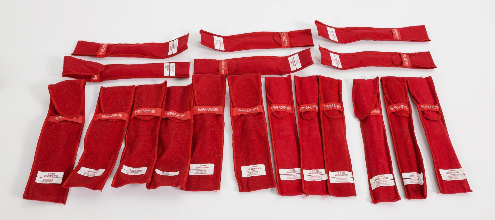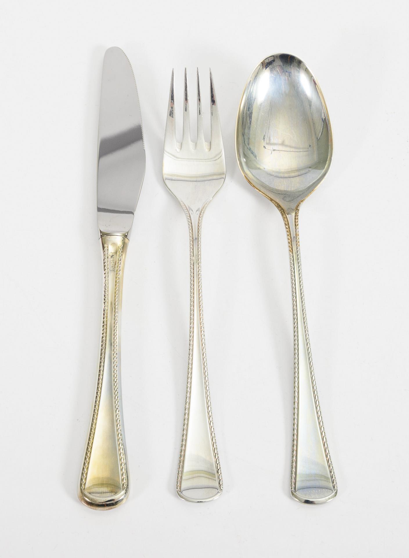 Elegantes Besteck mit Dekor "Königskordel". 3 originale Schachteln mit je 6 Messern, Gabeln und Suppenlöffeln, in originalen Filzhüllen. Kaum benutzt.