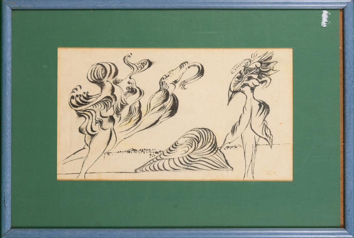 Tusche/Papier. Rechts unten undeutlich signiert, mittig unten undeutlich "In den blauen..." betitelt. Datiert: 1973.