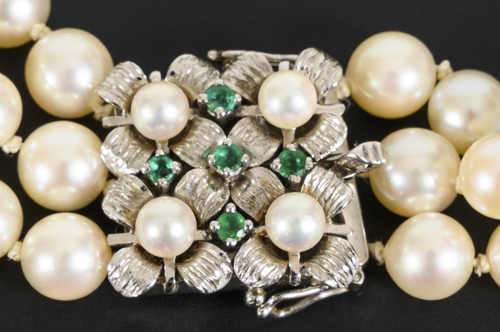Dreireihiges Perlenarmband mit einem großen Zierschloss in floraler Ausgestaltung, dieses zusätzlich mit 4 kleineren Perlen und 5 grünen Farbsteinen, wohl Smaragden, besetzt. Das Schloss mit doppelten Achtersicherungen.