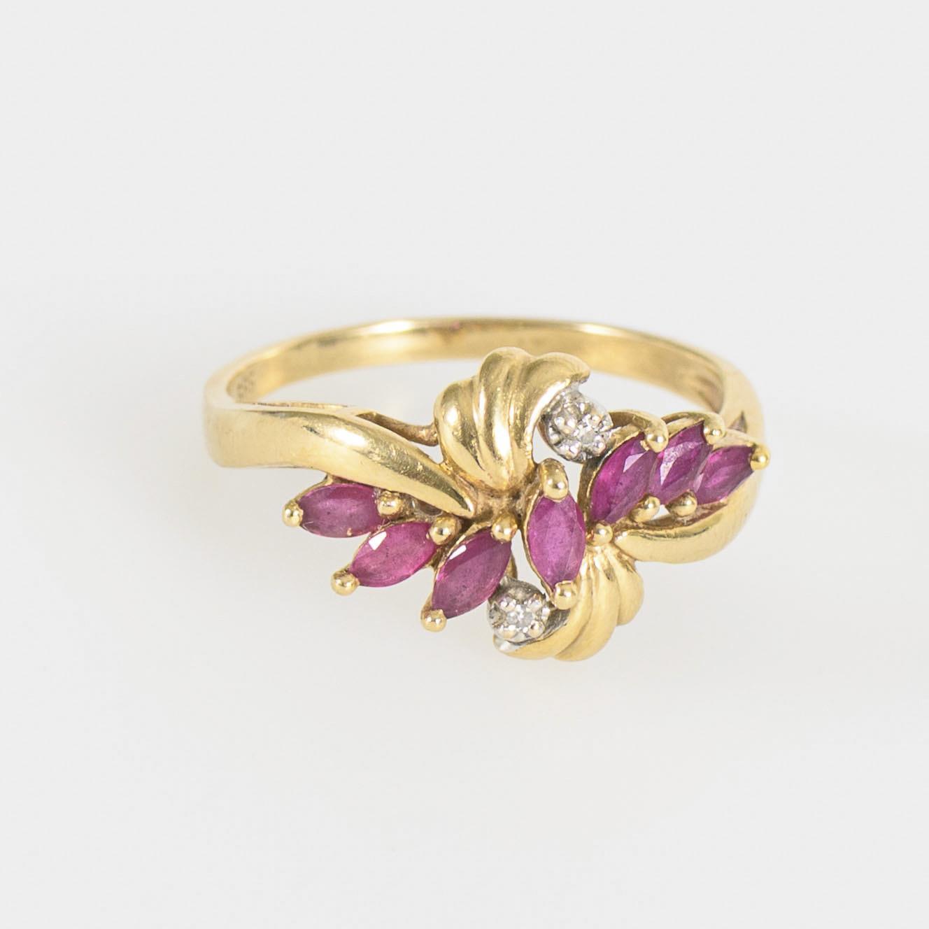 Sie befinden sich hier: Startseite Kategorien Schmuck Ring mit roten Farbstein-Navetten, wohl Rubine, und kleinen Brillanten