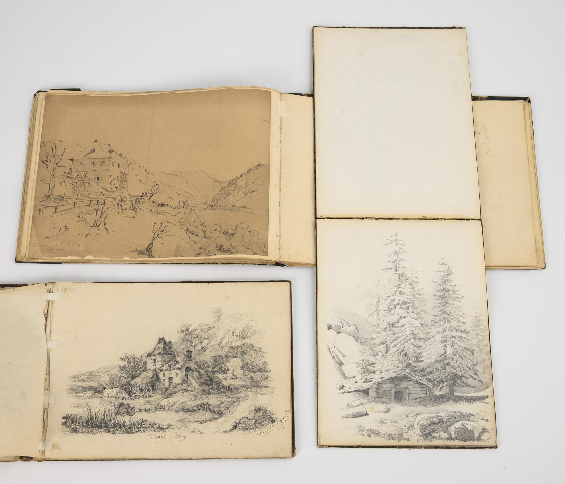 Überwiegend Bleistift- aber auch Kohle- und Federskizzen, punktuelle Aquarellierungen. Zum Teil Schweiz und Österreich bezeichnet.