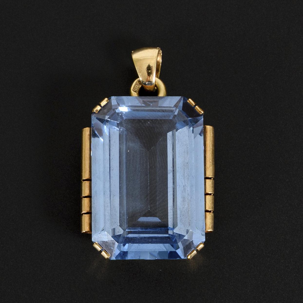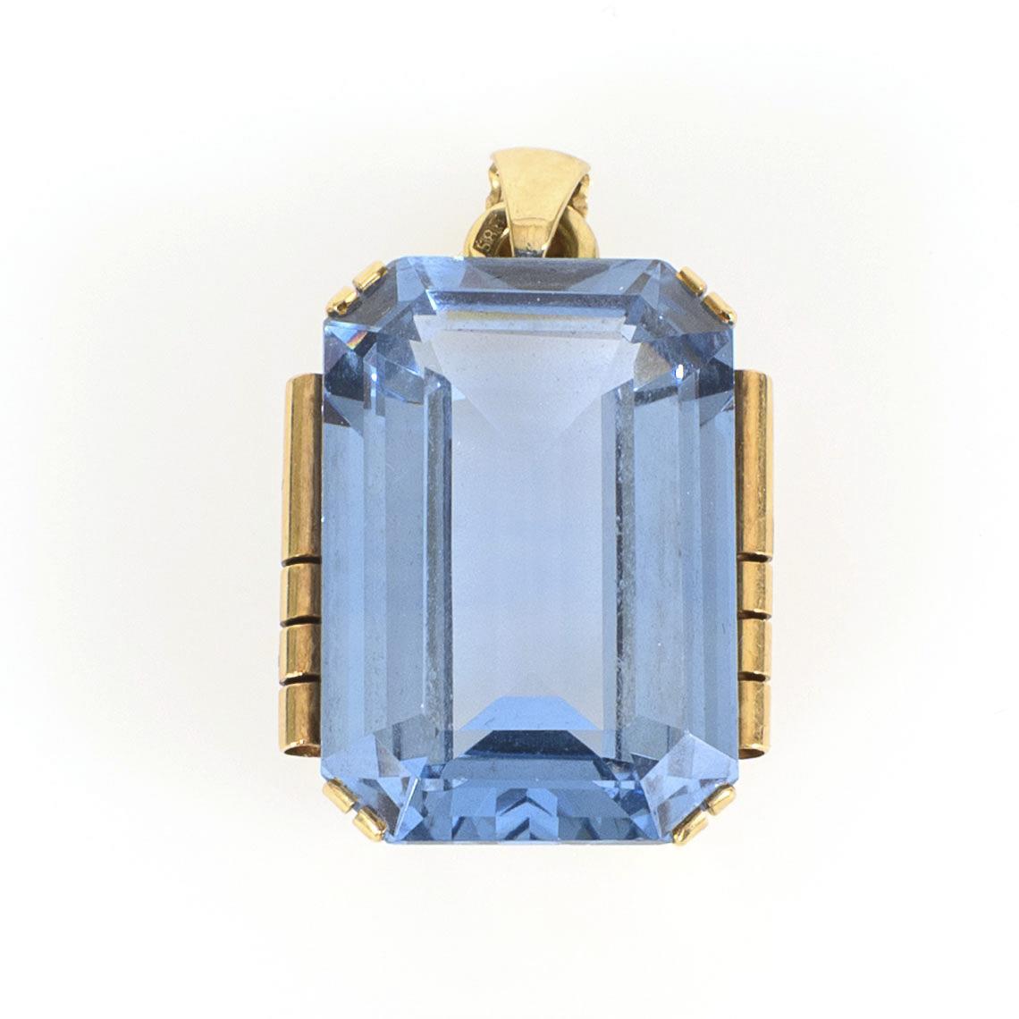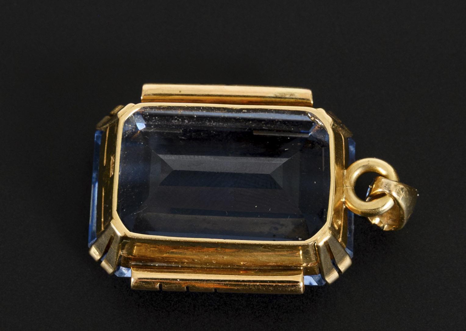 Großer, den Stein in den Vordergrund hebender Anhänger mit blauem Farbstein (wohl Spinell oder Aquamarin) oder Synthese.