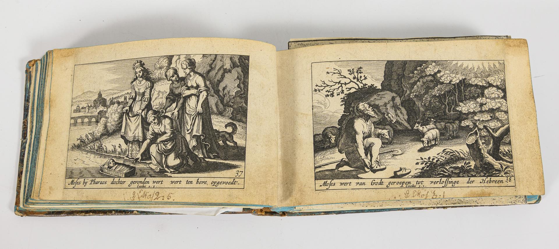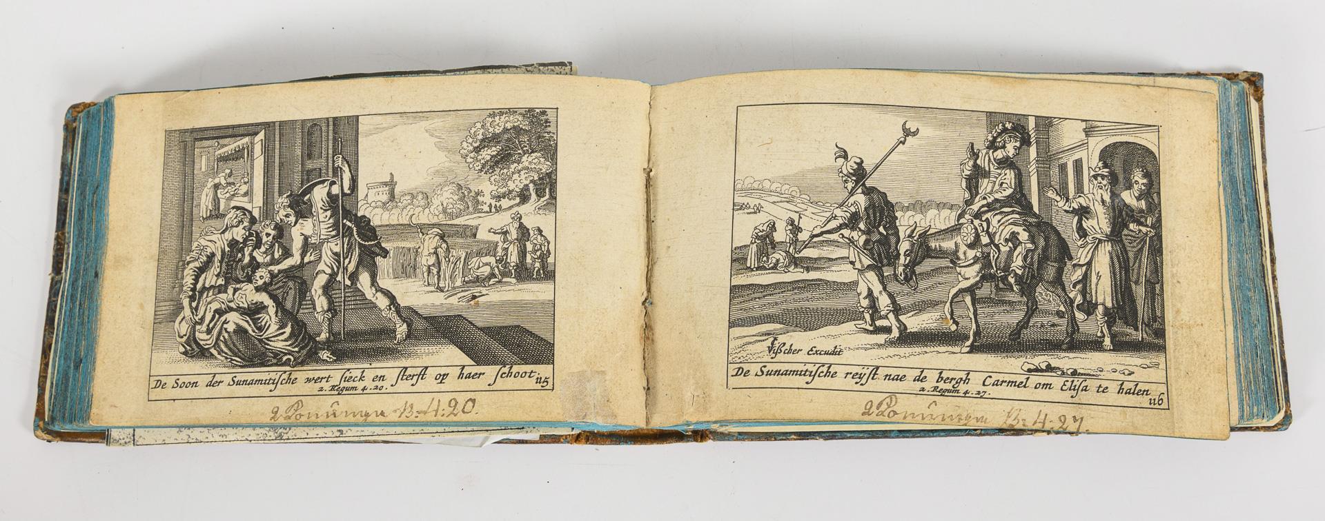 Erster Teil. 192 Bilder, die nummeriert und niederländisch bezeichnet sind, viele mit handschriftlichen Bemerkungen zu Bibelstellen. Es fehlen die Seiten 16, 17, 189, 190, 191 und das Titelblatt, diese sind mit neueren Kopien ersetzt. Wenige Seiten in falscher Reihenfolge gebunden. Teils handschriftliche Bemerkungen, teils fleckig. Halbledereinband, Blauschnitt.
