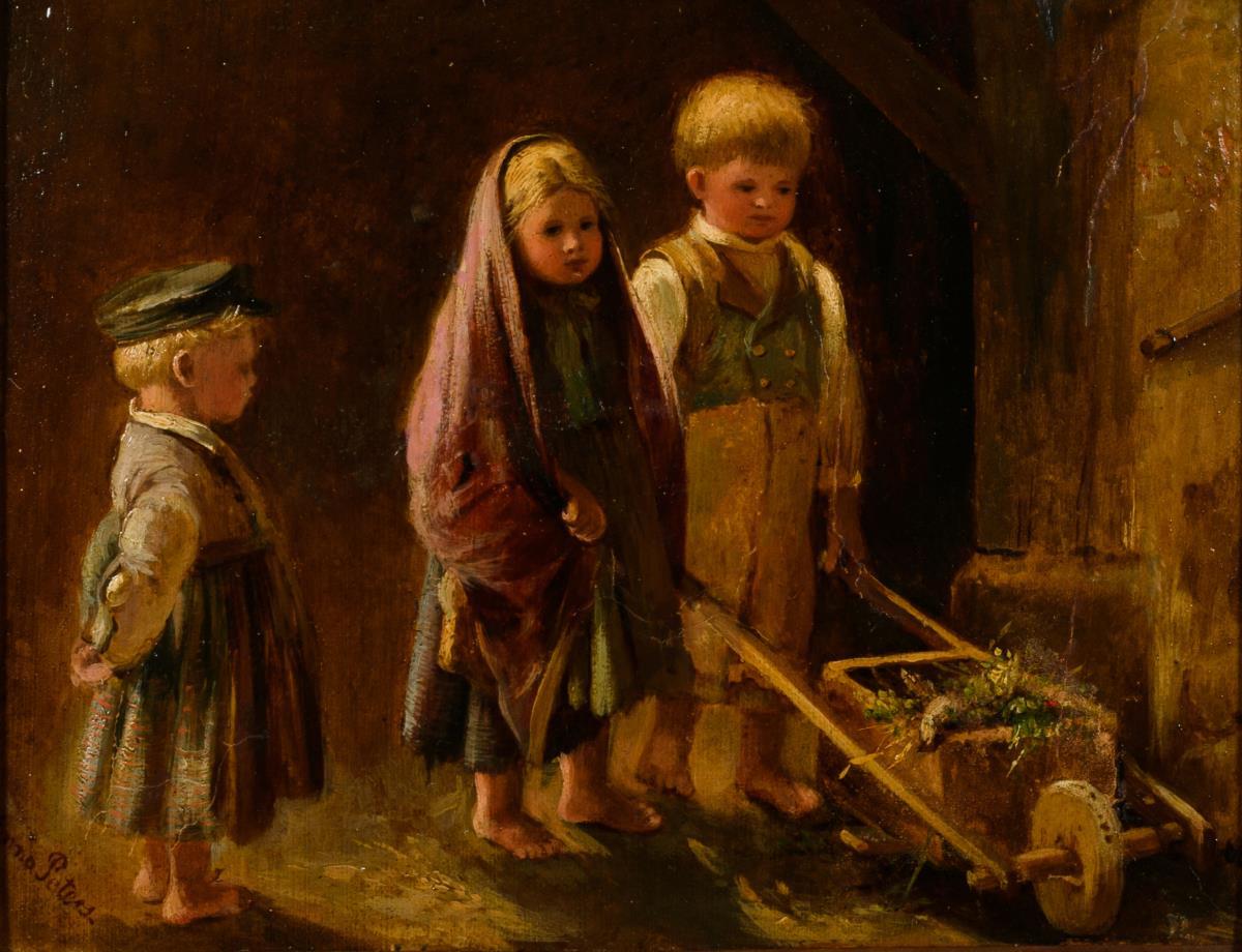 Die Kinder mit einer kleinen Schubkarre voll Blumen und einem toten Vogel. Wenig retuschiert.