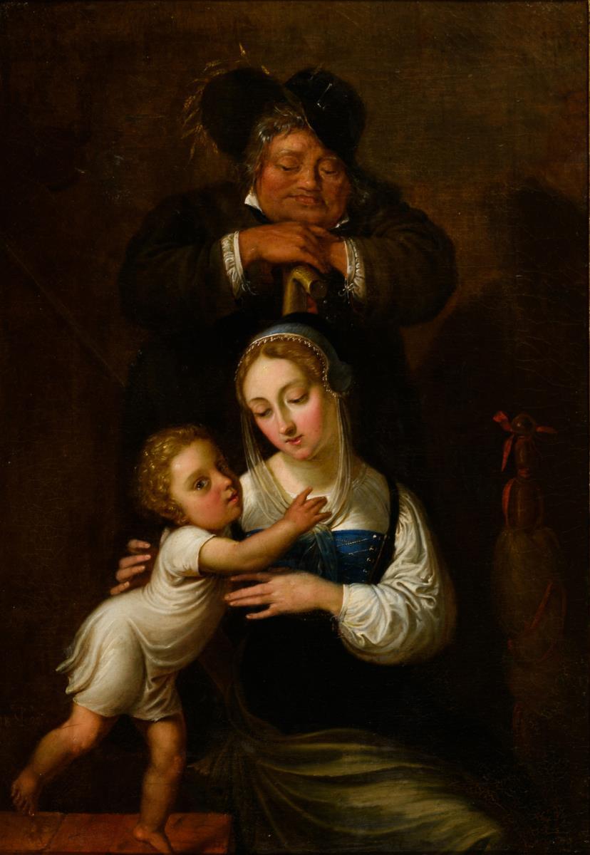 Qualitätvoll und detailreich gemaltes Bildnis einer Familie mit junger Mutter und Kind sowie dem stolz auf beide herabblickenden Vater. Eine kleine restaurierte Stelle mit Hinterklebung.