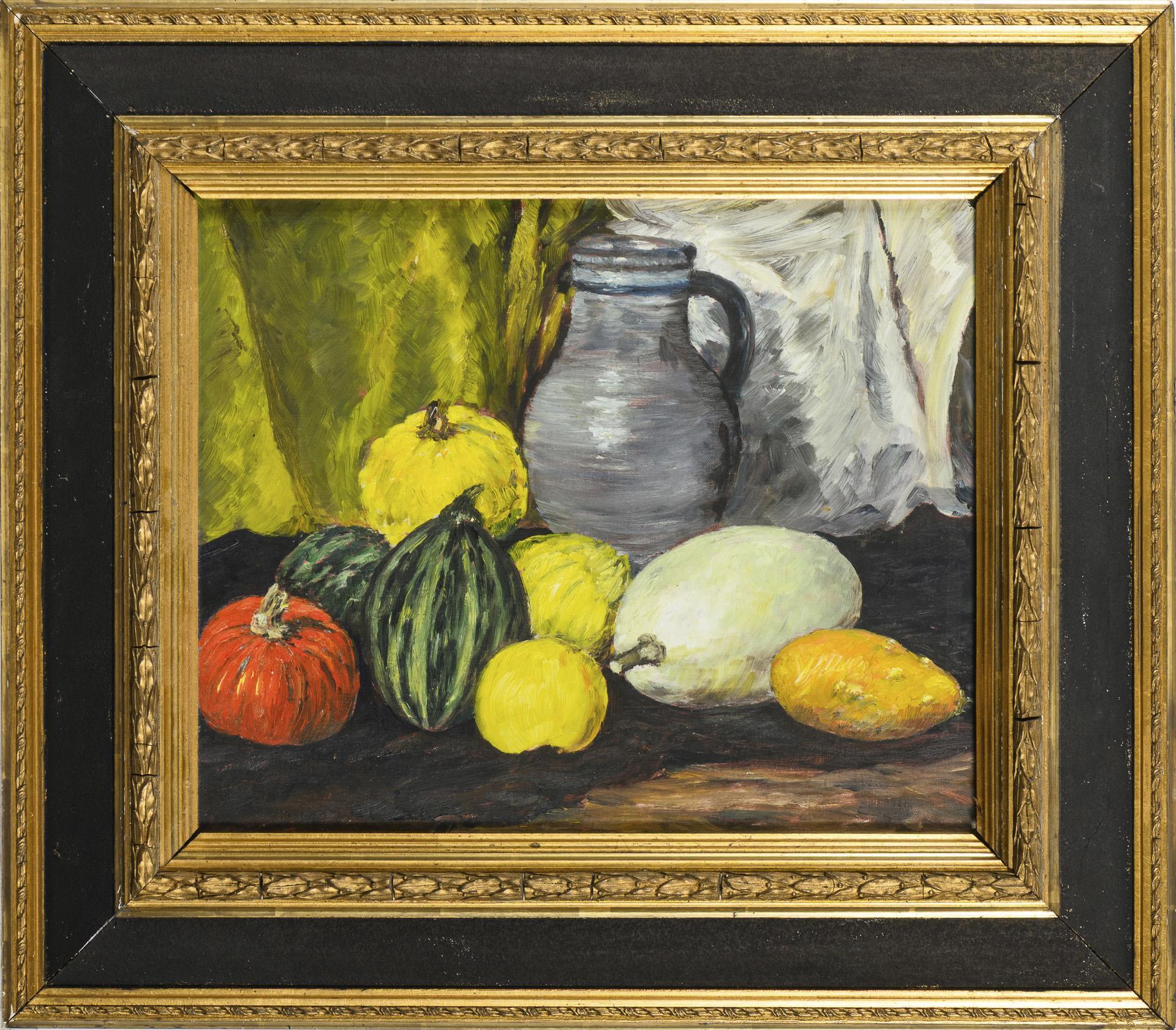 Verschiedene Kürbisse neben einem Zinnkrug.