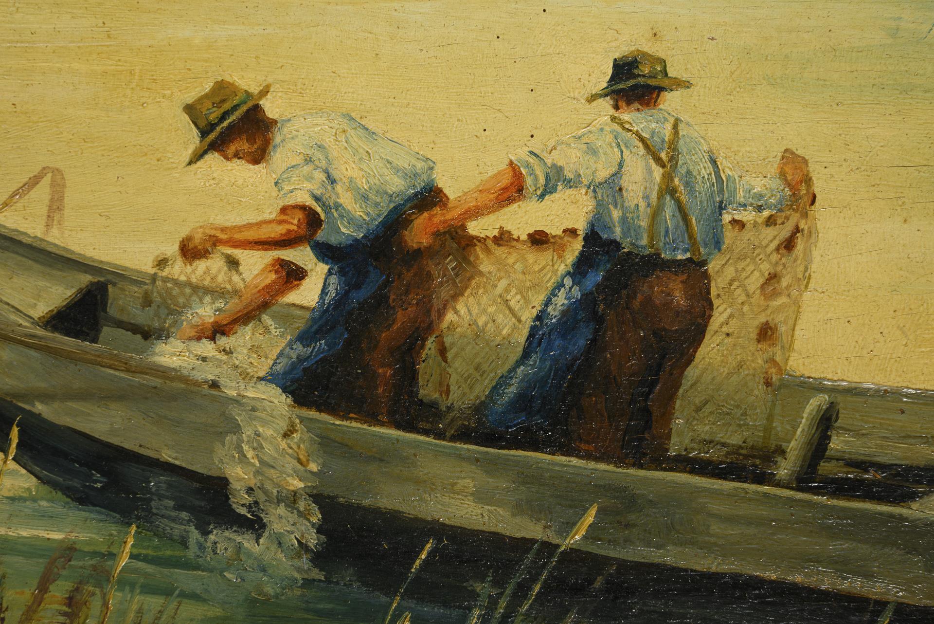 Fischer auf einem Boot am Ufer des Sees beim Einholen des Netzes.