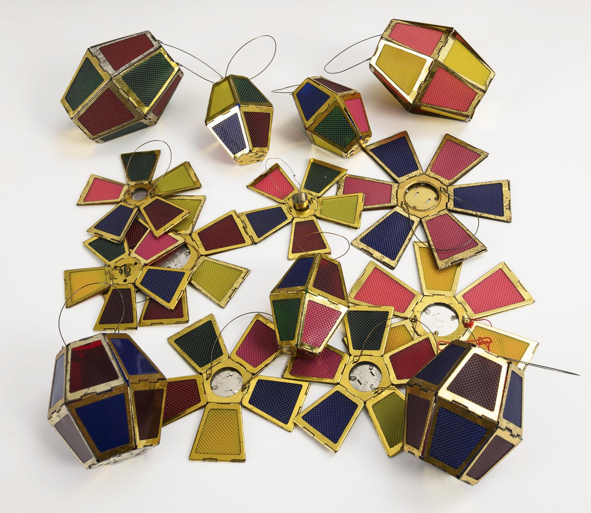 Ca. 23 Glaskugeln, 2 "Zauberlaternen" (1x im Originalkarton) und 15 klappbare Lampions mit farbigen "Gelatine"-Scheiben. Altersspuren, teils kleine Defekte. Eine Laterne mit verformten Scheiben.