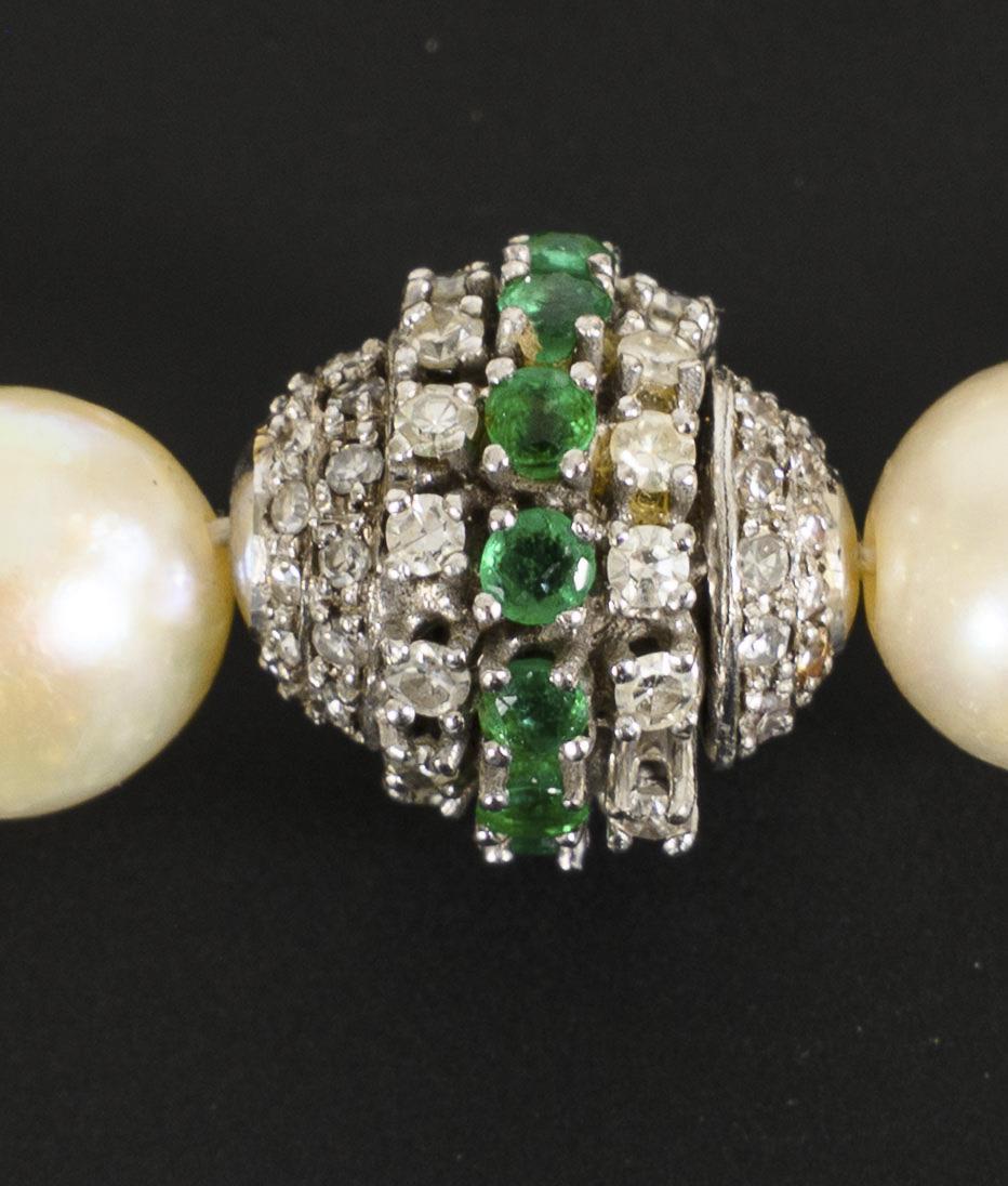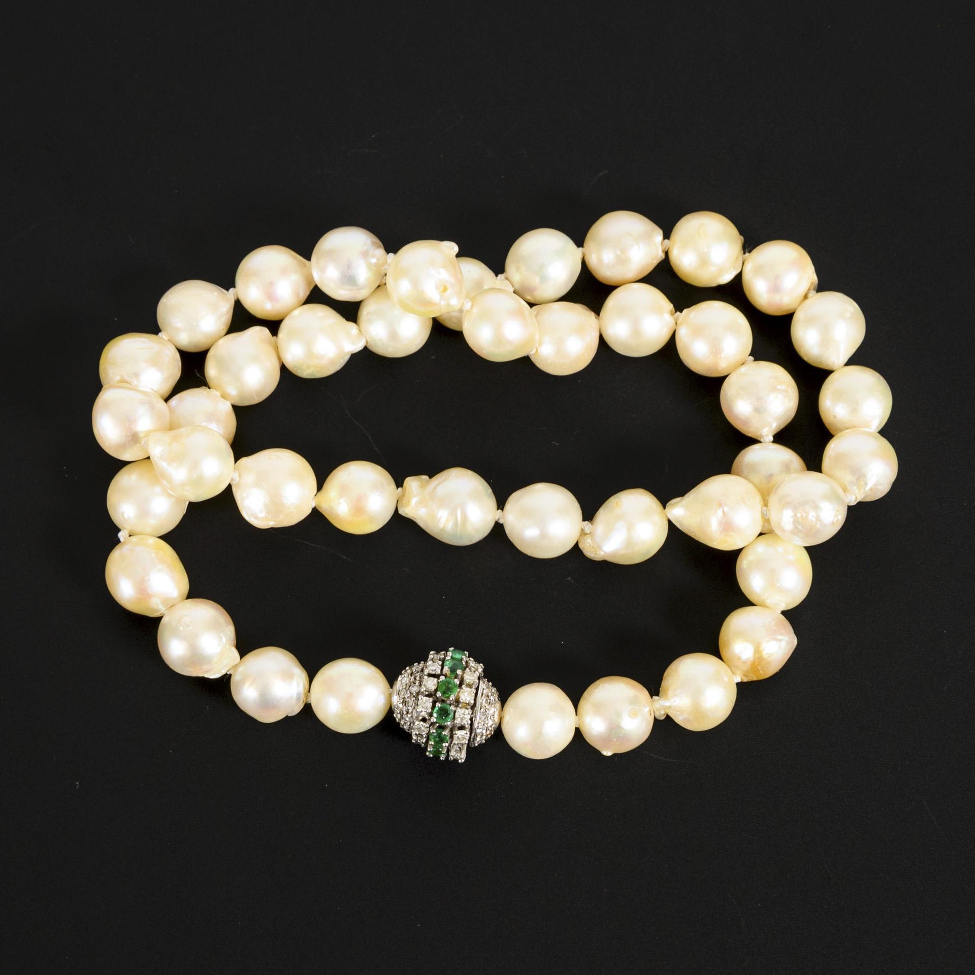 Kette aus einzeln geknoteten, barock geformten cremefarbenen Perlen, mit einer kugelförmigen Zierschließe in Weißgold. Diese umlaufend mit 24 Achtkant-Diamanten und 12 grünen Farbsteinen, wohl Smaragde, besetzt.