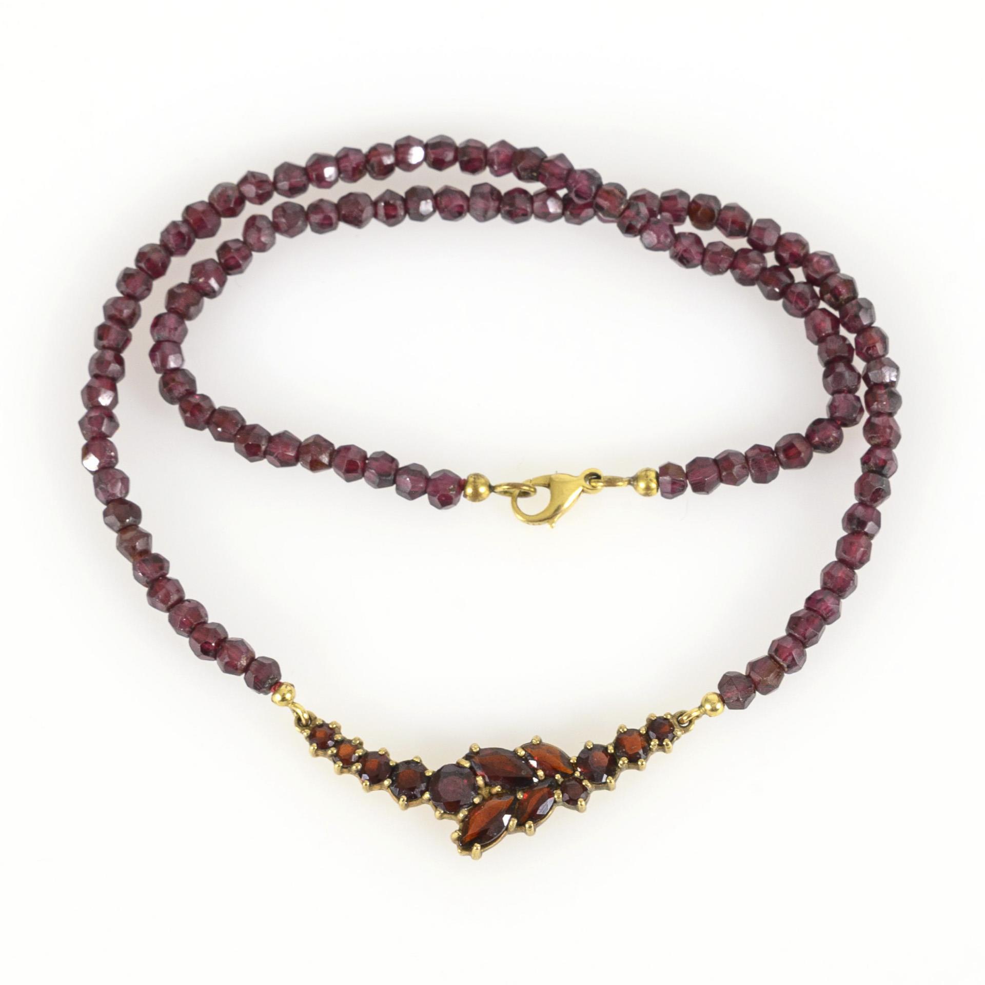 Das Mittelstück mit runden und navetteförmig geschliffenen Granaten besetzt, die Kette bestehend aus facettierten Rubin-Kugeln.