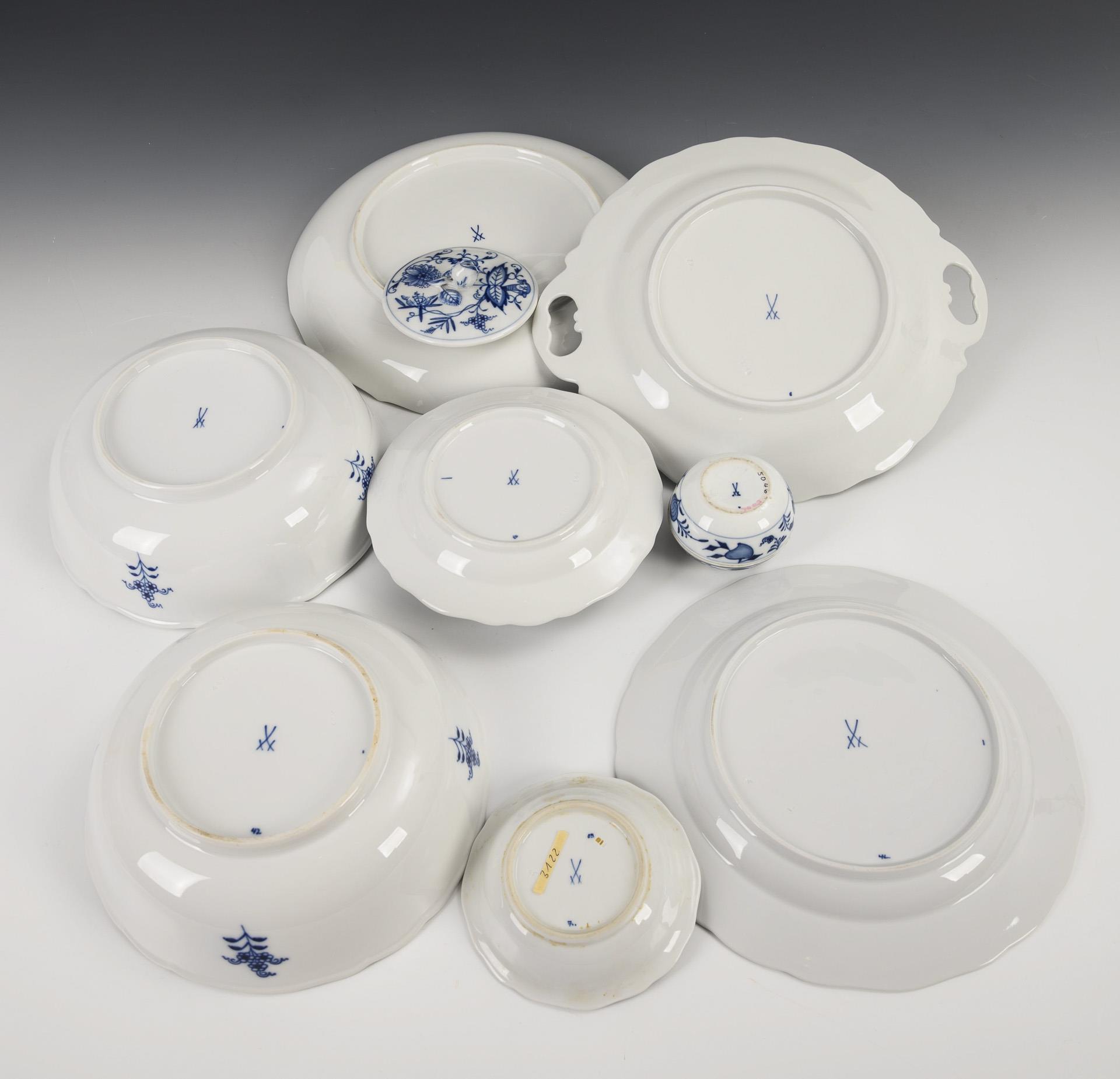 Form "Neuer Ausschnitt". Speiseteller, Kredenzteller (Ø 30,5 cm), Schale (Ø 28 cm), 2 Schüsseln (Ø 22 cm), 1 Butterdose (Ø 17,5 cm), 1 Kompottschälchen und 1 Döschen (H 5 cm). Butterdosenknauf bestoßen.