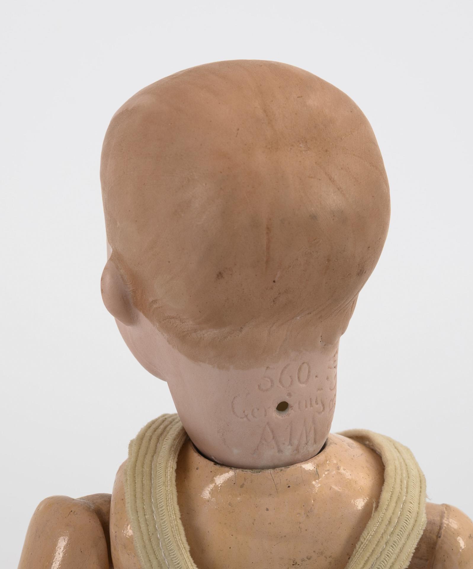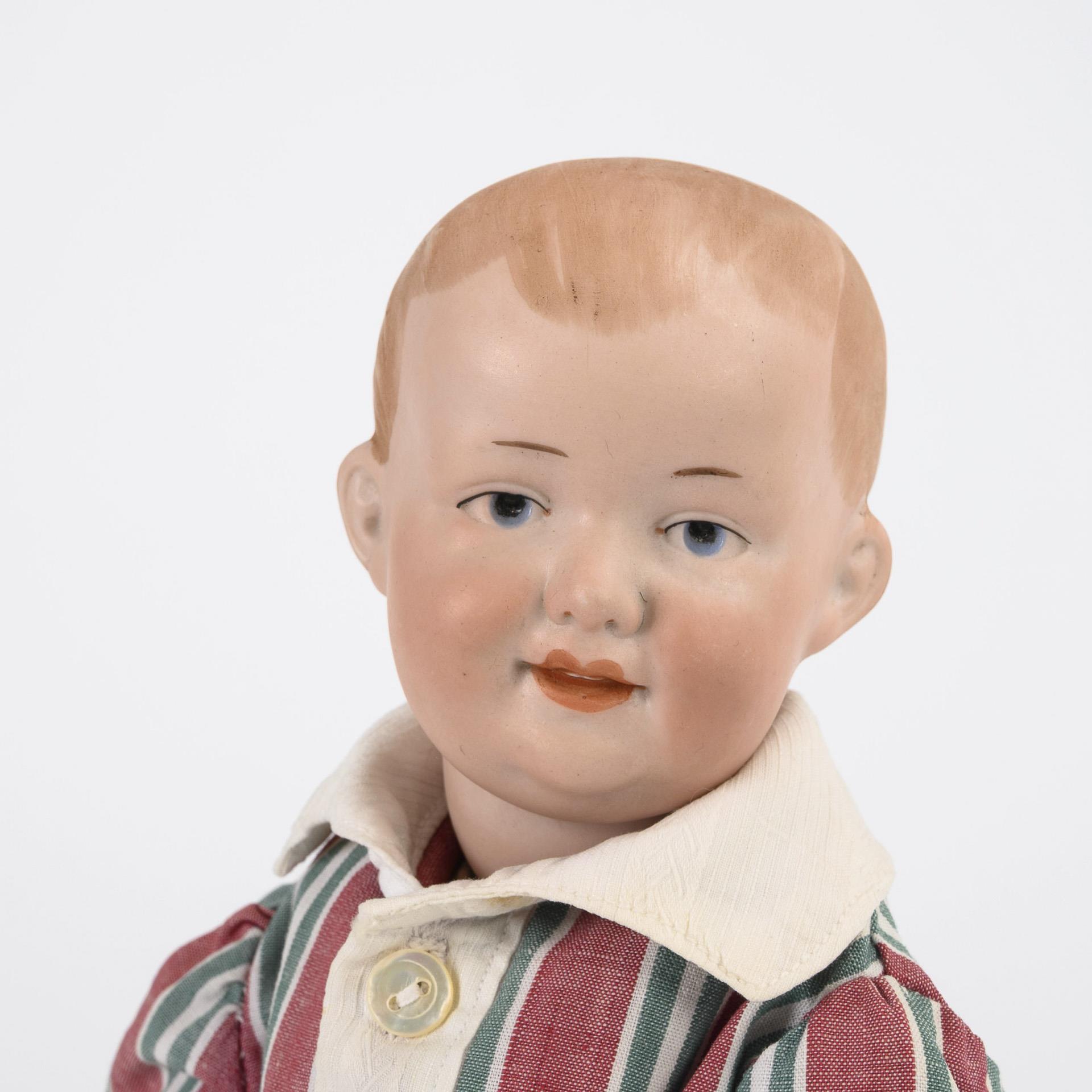Kurbelkopf, blaue Intaglio-Augen, modellierte braune Haare, 11-teiliger Gliederkörper, gestreiftes Hemd und helle kurze Hose. Körper mit Ergänzungen.