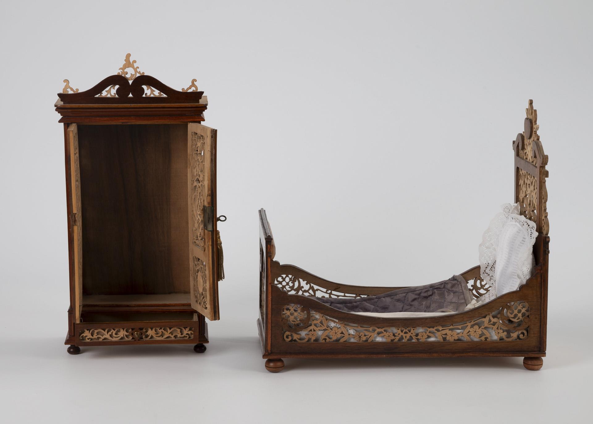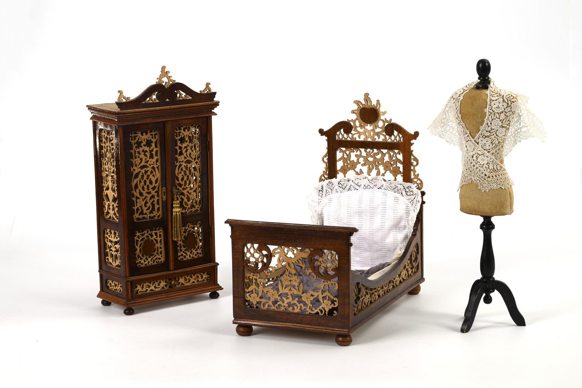 Elegante Möbel mit ausgesägtem Gitterwerk: Bett (L 34 cm) und 2-türiger Kleiderschrank (H 38 cm). Dazu Schneiderpuppe auf schwarzem Drechselfuß (H 39 cm). Kleine Defekte und Ergänzungen.