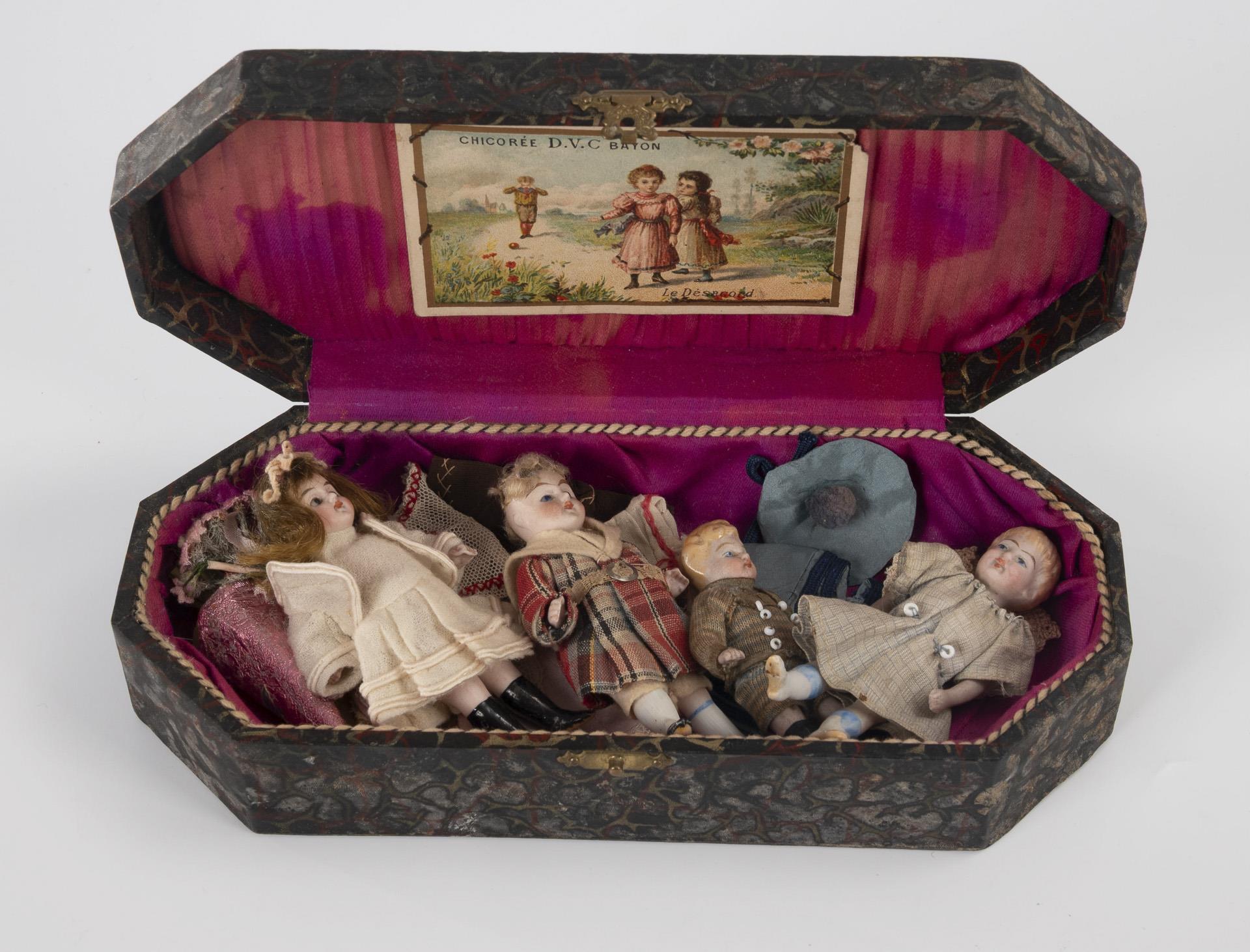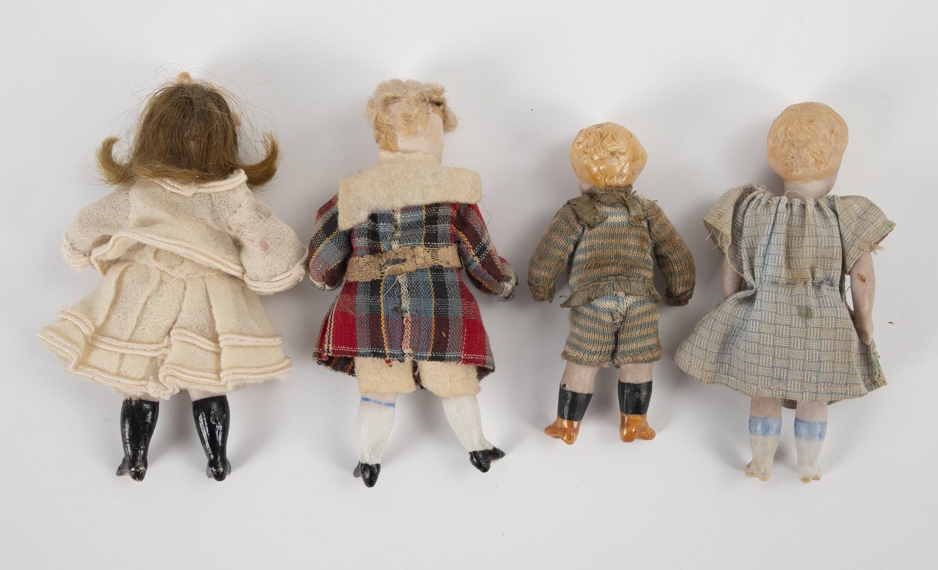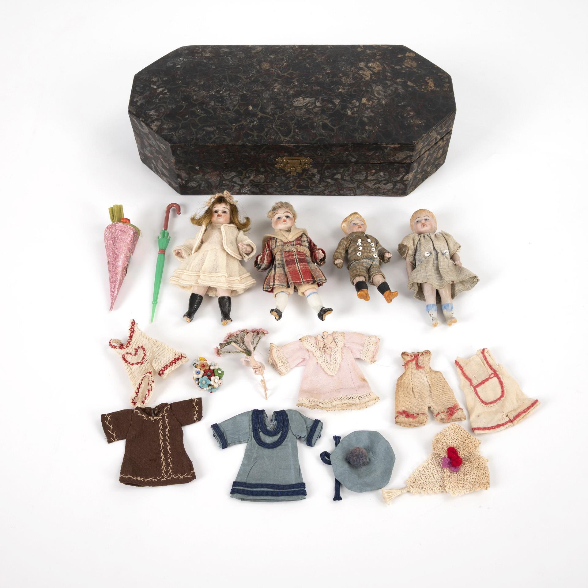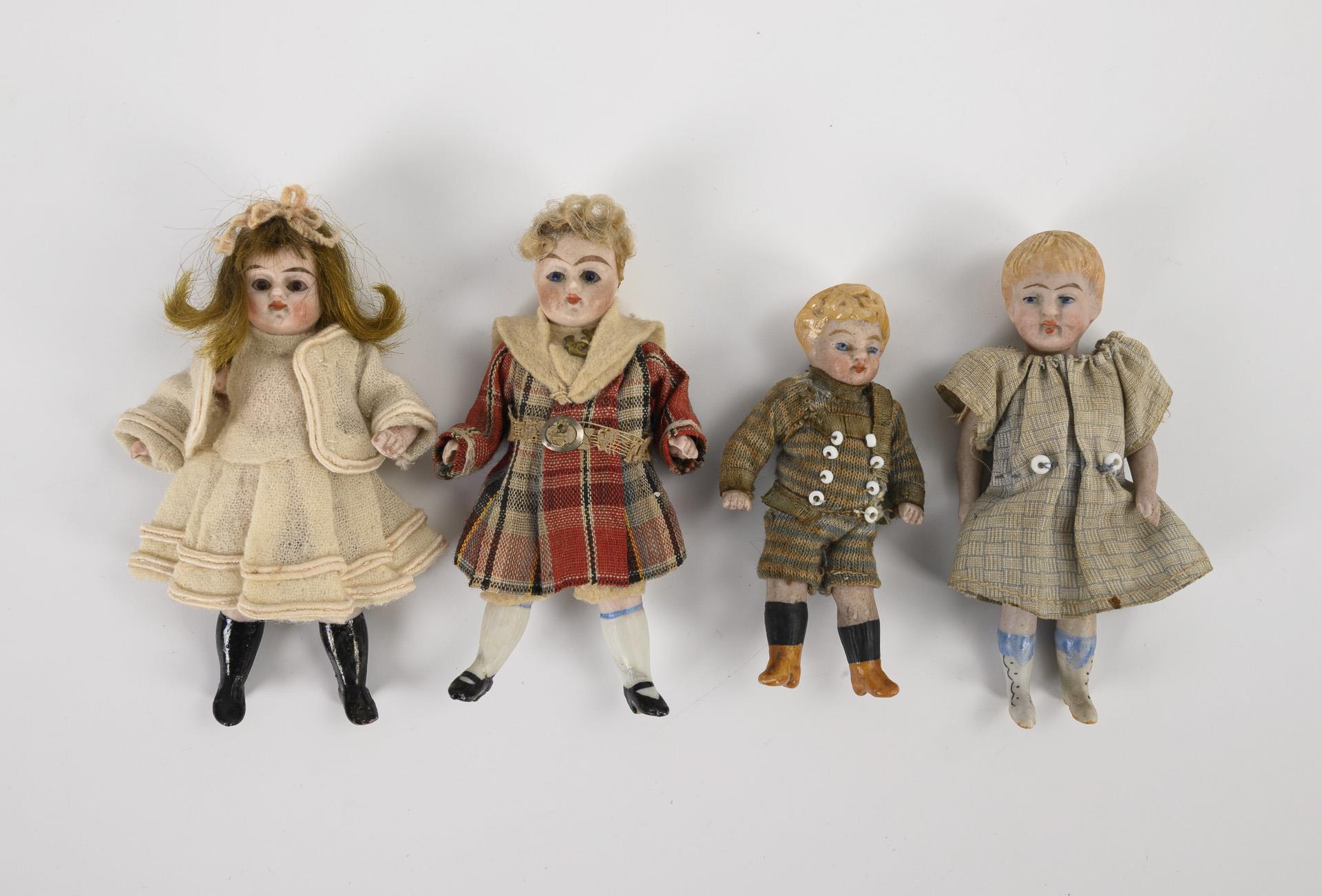 4 originalbekleidete Ganzbiskuit-Püppchen: 2x mit Glasaugen und Perücke, 2x mit gemalten Augen und modellierten Haaren. L 8 - 9 cm. Dazu einige Teile Kleidung. Altersspuren.