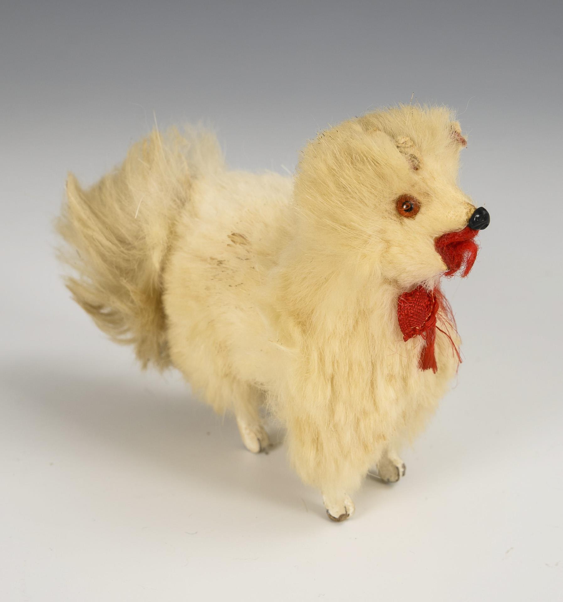 Verschiedene Puppenstuben-Püppchen, darunter 1 größeres Googly mit repariertem Körper. L 5,5 - 16 cm. Dazu lithografiertes Blechtablett und weißer Fellhund mit rotem Halsband. Altersspuren und kleine Defekte.