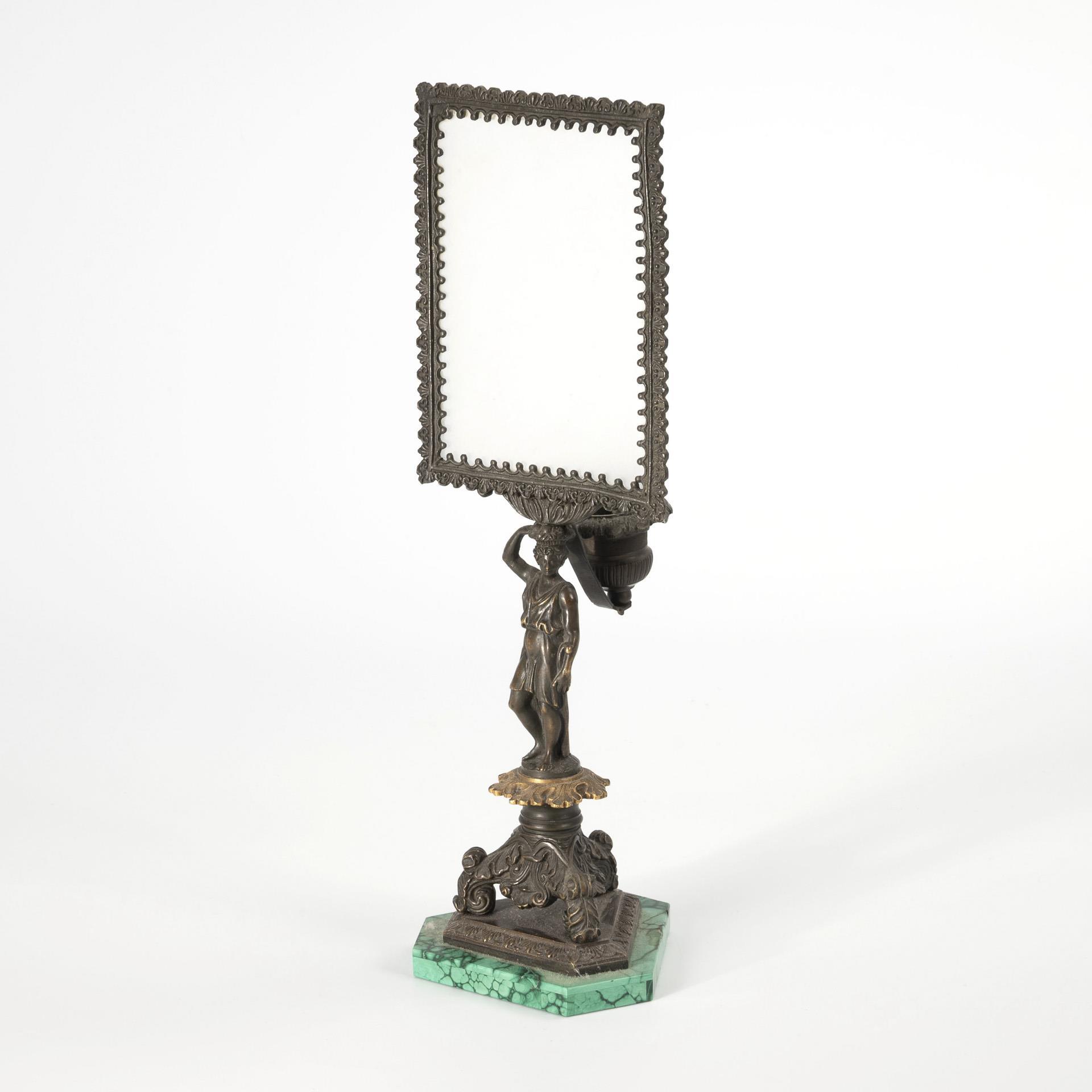 Sie befinden sich hier: Startseite Kategorien Metallarbeiten Figürlicher Kerzenleuchter mit Lichtschirm in der Art des Empire