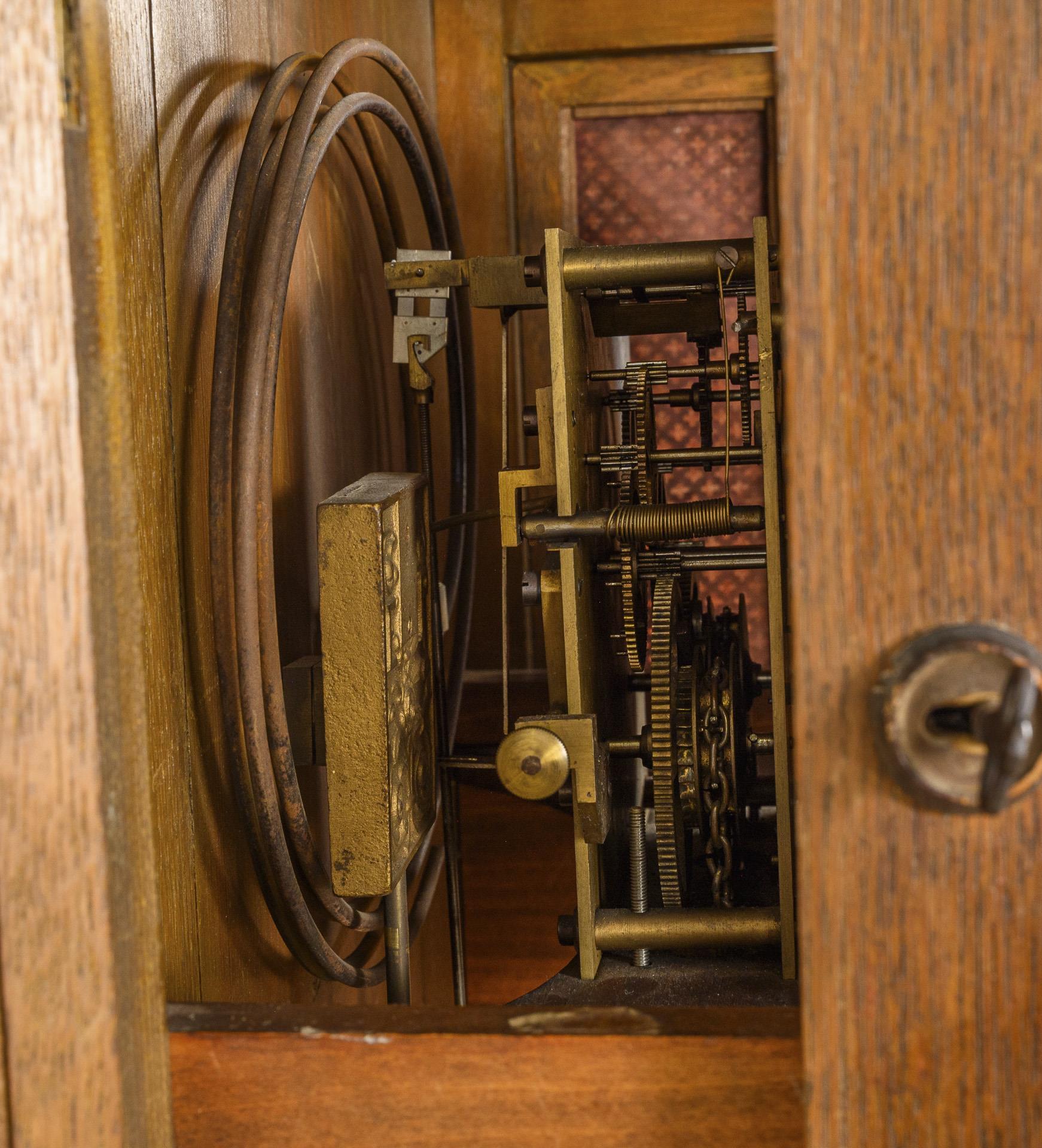 Profiliertes Gehäuse mit getrepptem Giebel und beschnitzter Wappenzier mit ligiertem Monogramm, freischwingendes Pendel in offenem Pendelkasten mit gedrehten Säulen und kleiner Balustrade, hoher Sockelbereich mit Kassettenschmuck.