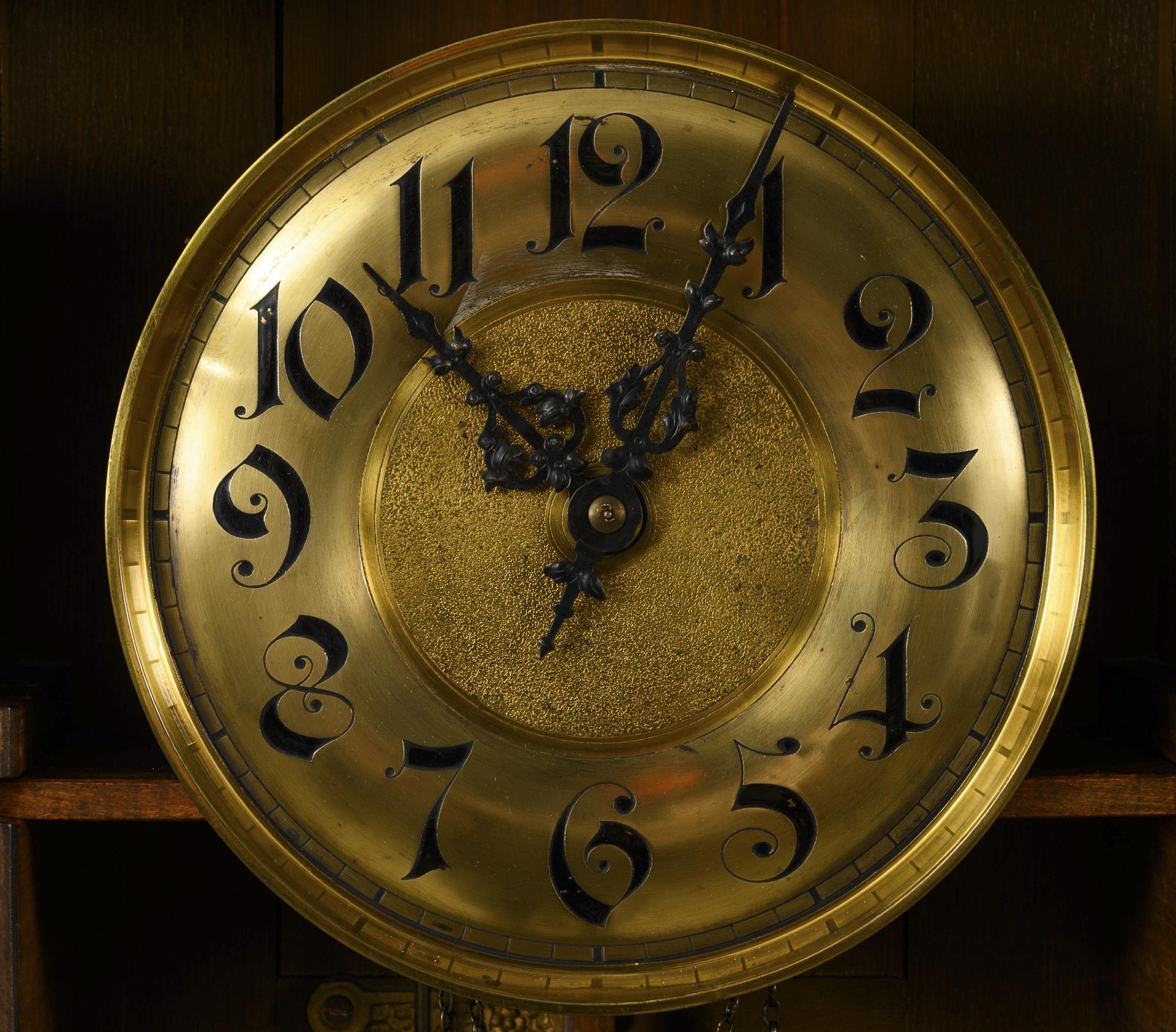 Ungemarktes Werk mit Halbstundenschlag auf Rundgong. Im Kurzzeittest funktionstüchtig. Messingziffernblatt mit arabischen Zahlen, Minutenkranz und durchbrochenen Zeigern.