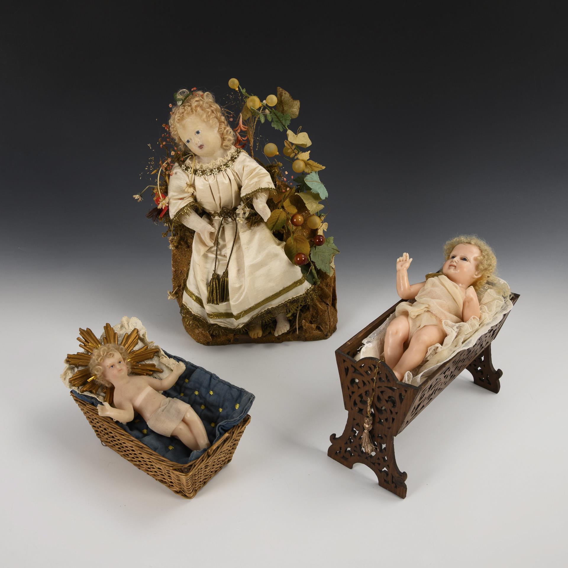Umgeben von Blumen und Früchten auf der Erde sitzendes Kind (Maria oder Jesus) im langen Seidengewand. Liegende Jesuskinder in der Wiege bzw. im Korb. 2x fehlende Finger, sonst wenige Alters-/Gebrauchsspuren.