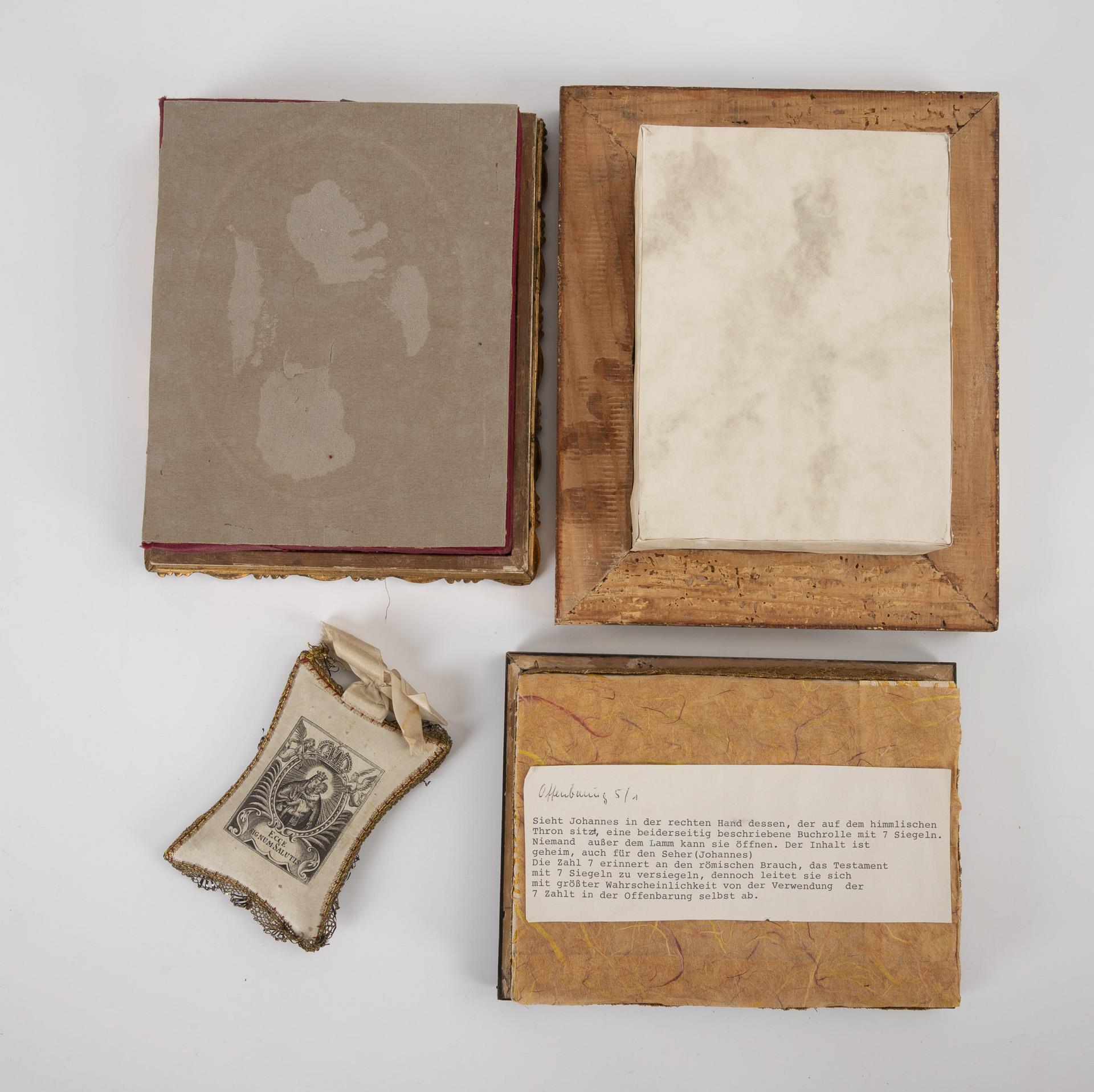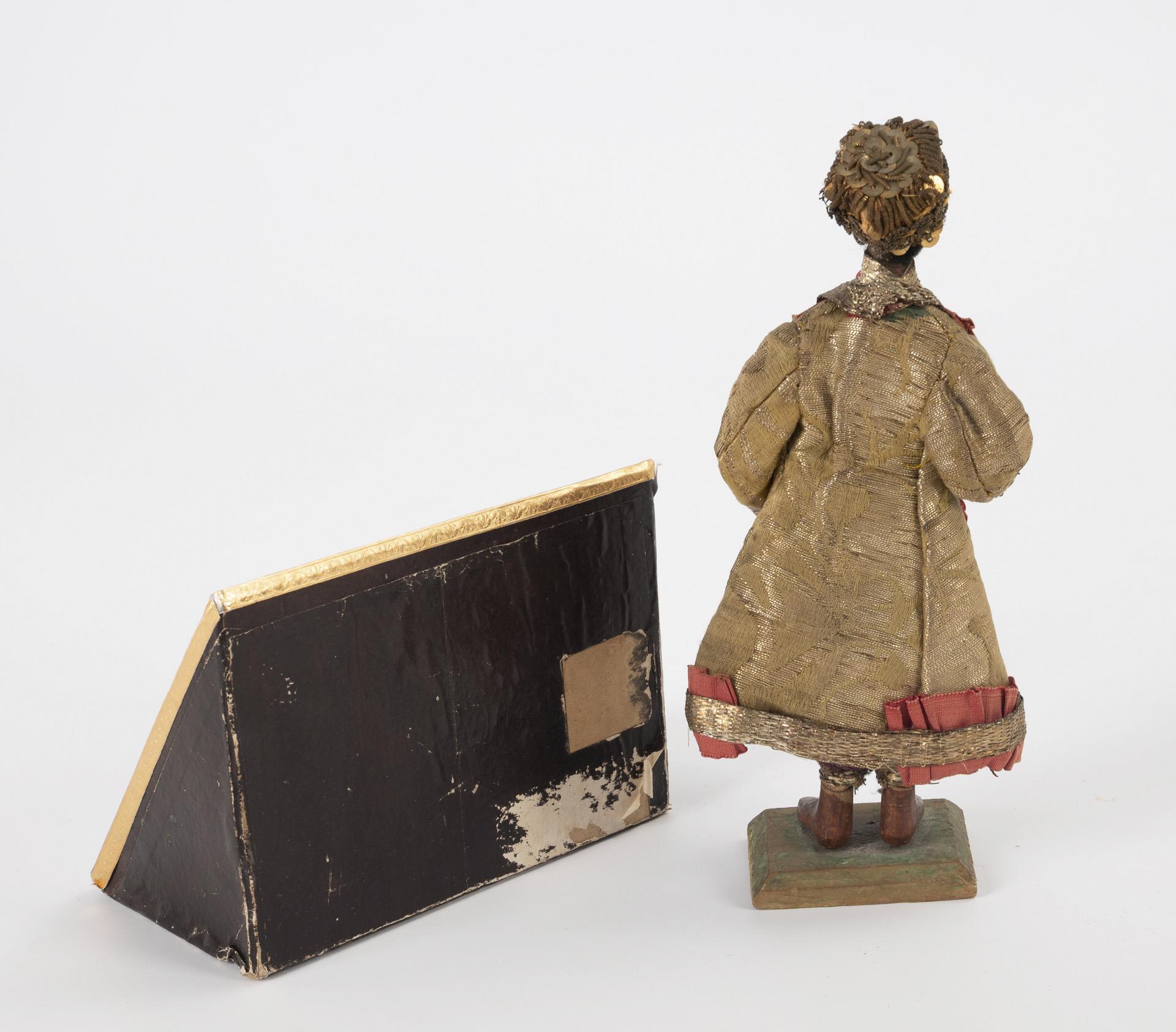 Auf einer Plinthe stehender Afrikaner im prachtvollen Gewand. / 4 verglaste Schaukästen mit Klosterarbeiten: Wachsbildnisrelief von Pius V., Unbeflecktes Herz Mariä, apokalyptisches Lamm auf dem Buch mit 7 Siegeln, Anbetung des Jesuskindes in der Krippe durch Engel. / Breverl-Kissen mit reicher Klosterarbeit, rückseitig Druck auf Seide: Unsere Liebe Frau auf dem Berge Karmel mit Schriftzug "Ecce Signum Salutis". Krippenfigur und Gehäuse leichte Alters-/Gebrauchsspuren.