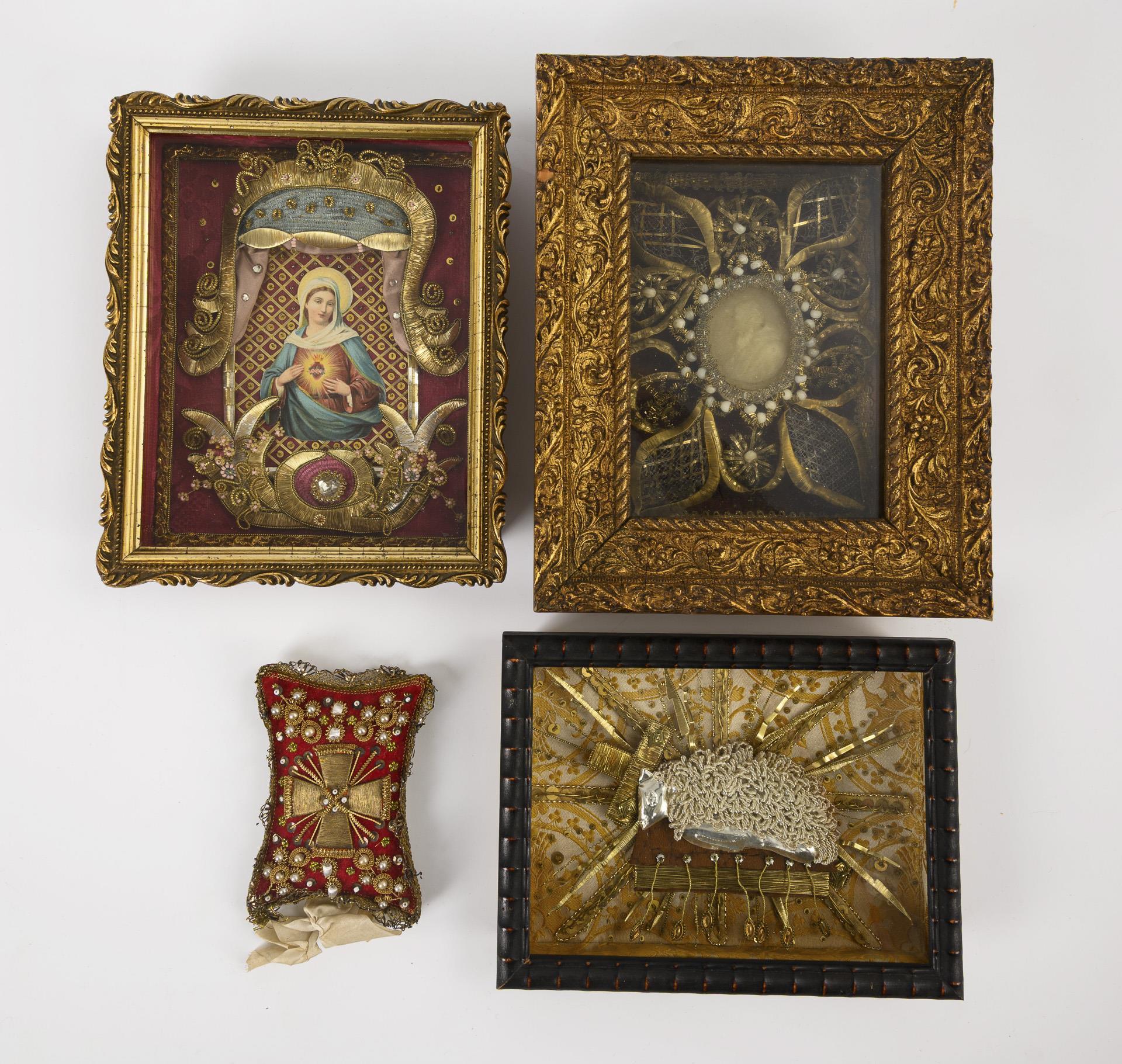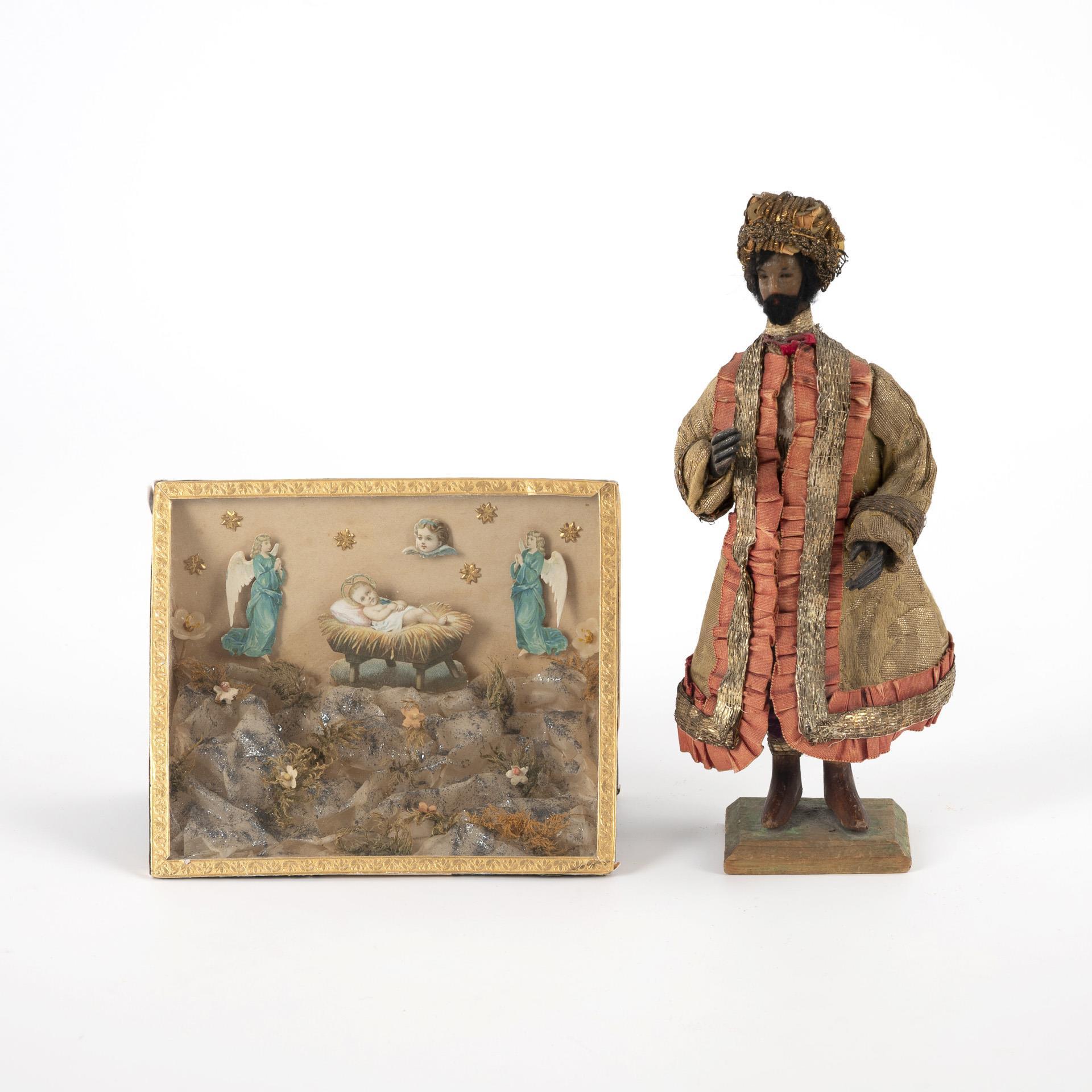 Krippenfigur: Wachskopf, schwarze Mohairhaare, Holzkörper, Drahtarme und Holzhände, Holzbeine, Stoff mit Lahn und Kantillen. / Klosterarbeiten teils mit Farblithografien, 1 Wachsrelief. Rahmen aus Holz bzw. Karton, 2 mit Goldstuckleisten. H Krippenfigur 20 cm, Kasten maximal 24 x 19 x 6 cm.