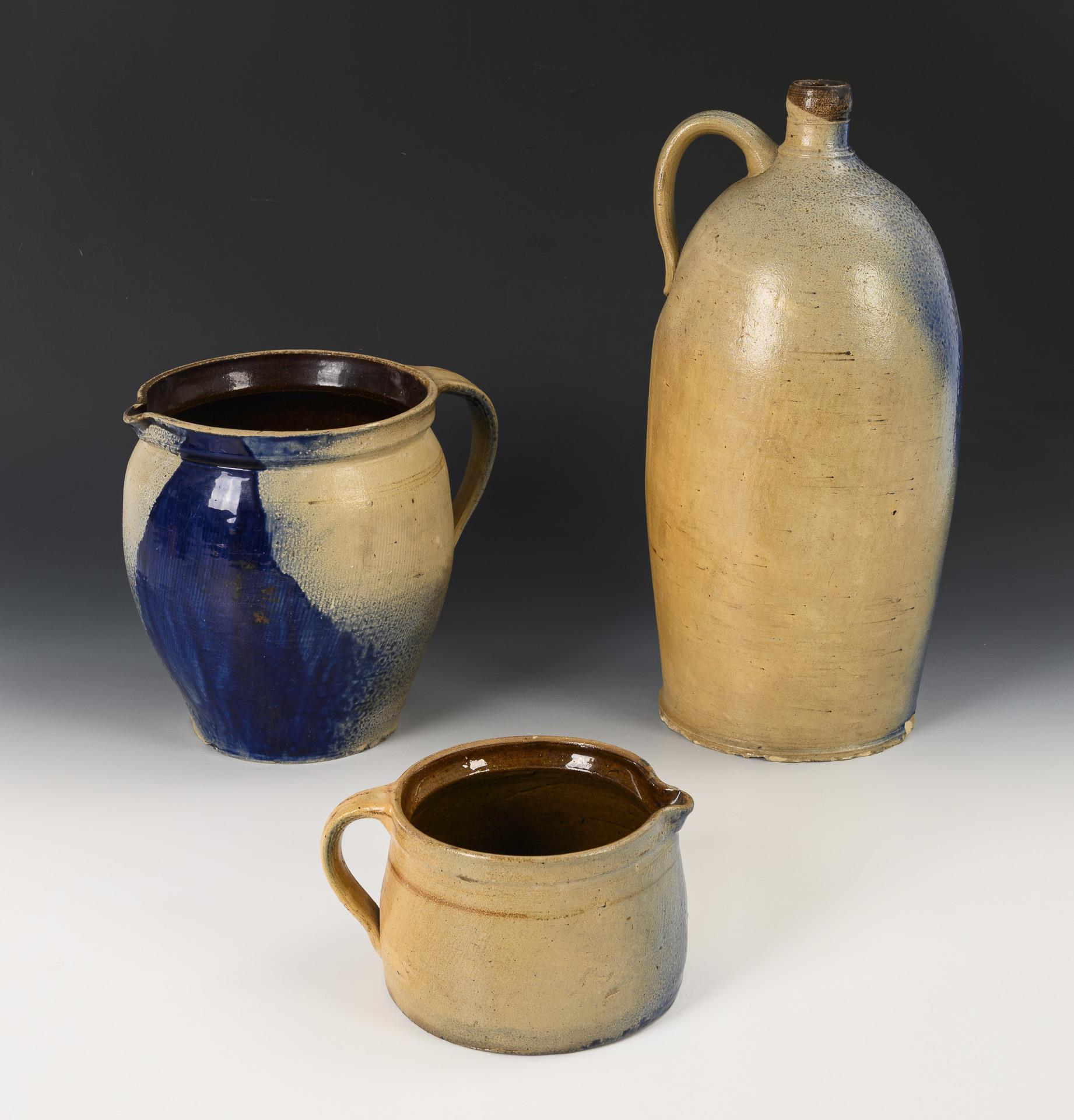1 große Enghalsflasche mit hoch angesetztem Henkel, 1 großer und 1 kleiner Henkeltopf mit kleiner Schneppe. Leichte Alters- und Gebrauchsspuren, teils mit Bestoßungen, großer Henkeltopf mit Riss im Mündungsbereich.