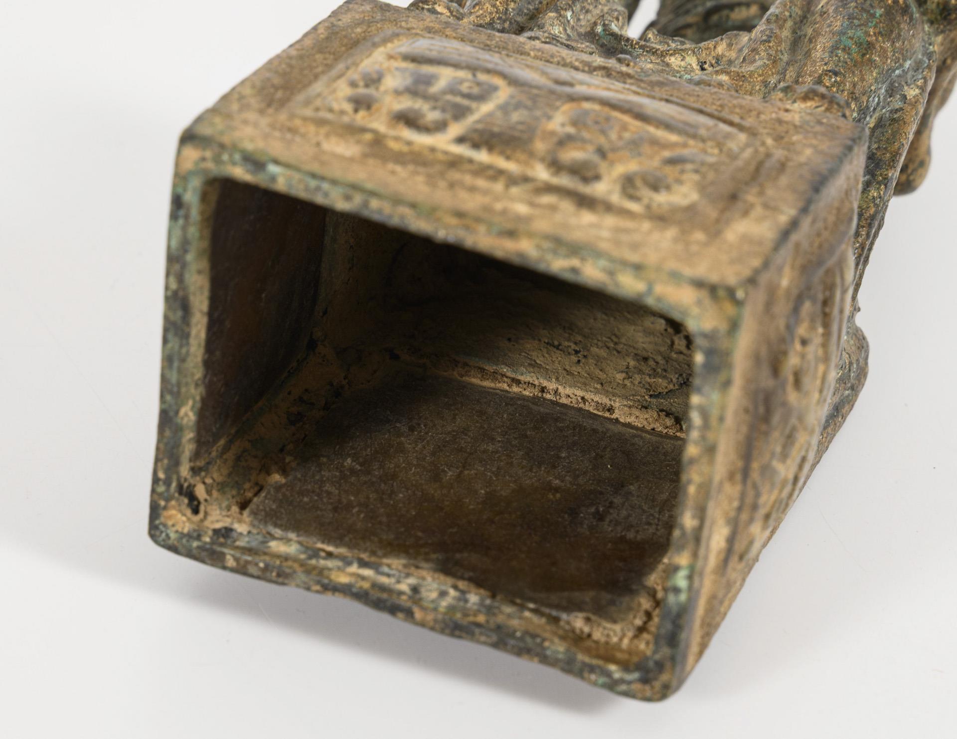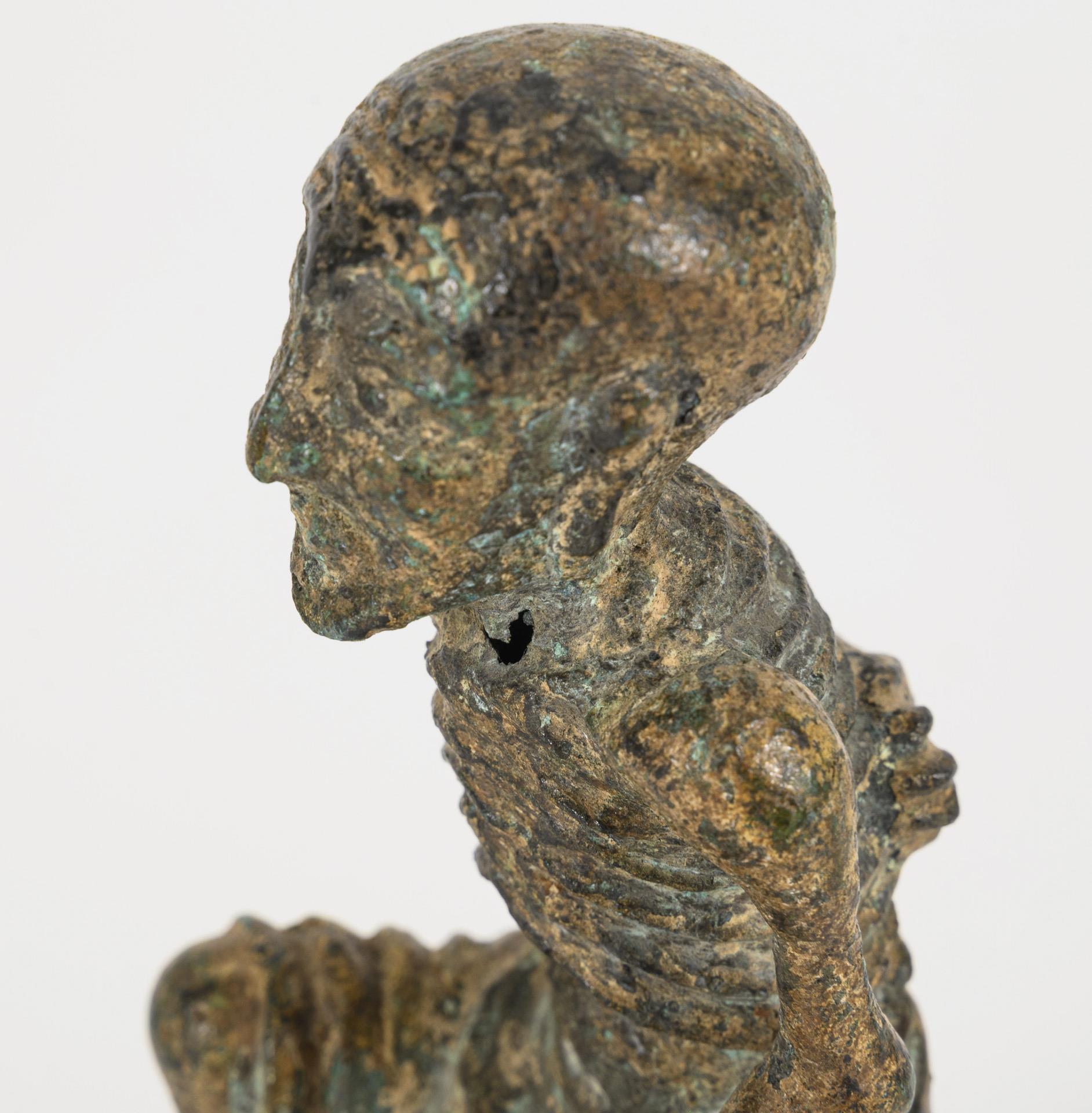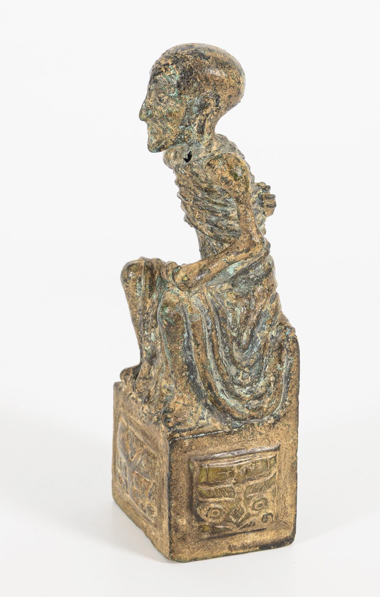 Sitzender, abgemagerter Yogi mit einem hinter dem Rücken gehaltenen Arm. Auf rechteckigem Sockel mit eingesetzten Reliefplatten. Oberflache patiniert.